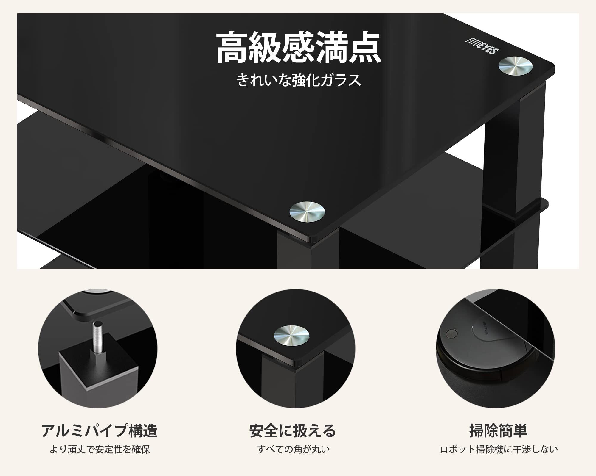 「頑丈で安定」:マット黒いアルミ方管と厚み8mm/5mm強化ガラス棚を組み合わせ、立派で頑丈な重構造になり、安定性と安心感を一緒にもたらします。再生音の秀逸さは言うまでもなく、オーディオラックに必要な性能を備えるとともにインテリア性も両立します。