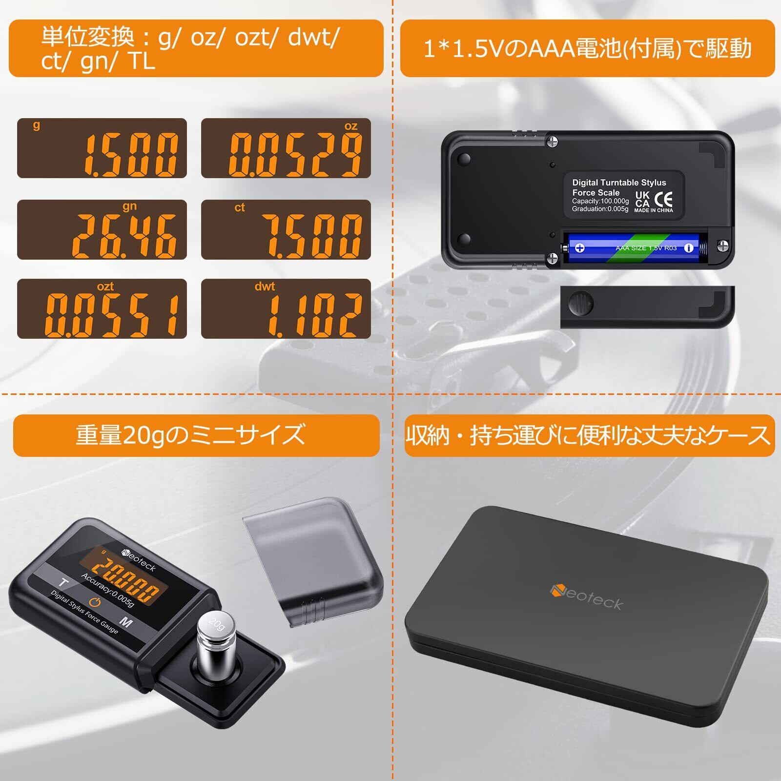 Neoteck 針圧計 レコードプレーヤー用 高精度 スタイラスフォースメーター レコード 100gまで測定 0.005g精度 収納ケース 日本語説明書付き 18ヶ月期間