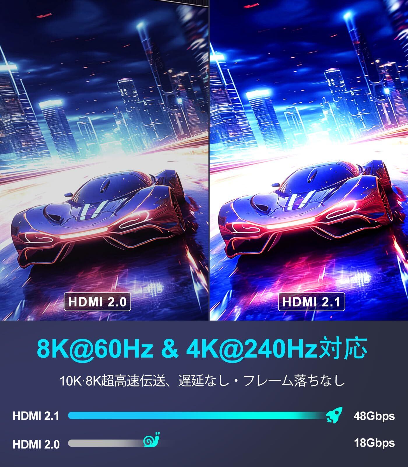 48Gbps超高速HDMIケーブル: 48Gbpsの帯域幅を備えたHDMI 2.1ケーブルは、非圧縮の8K(7680×4320)映像を信号損失なく高速伝送できます。これはHDMI 2.0(18Gbps)よりも2.6倍高速です。4K@240Hz HDMIコードは可変リフレッシュレート(VRR)とQFT(Quick Frame Transport)をサポートし、ディスプレイの遅延を低減します。自動低遅延モードや映像モード切替時の暗転を防ぐHDMI VRRメカニズムも搭載しています。