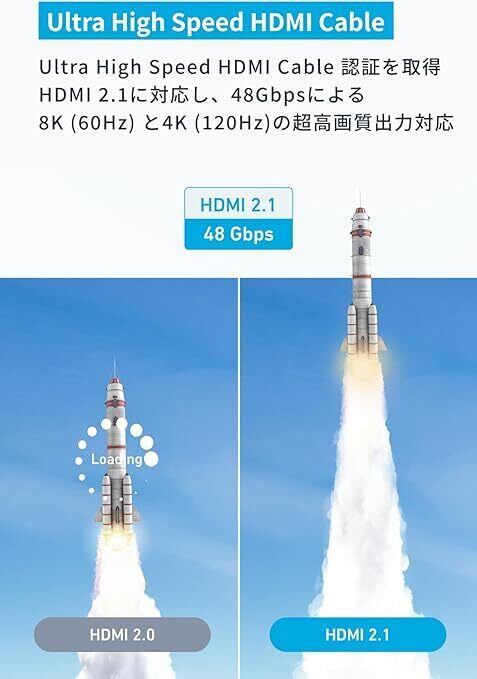Ultra High Speed HDMI Cable 認証取得:Ultra High Speed HDMI Cable認証を取得し、HDMI 2.1に対応しています。超低遅延での映像出力を実現し、大画面でもストレスなくコンテンツをお楽しみいただけます。