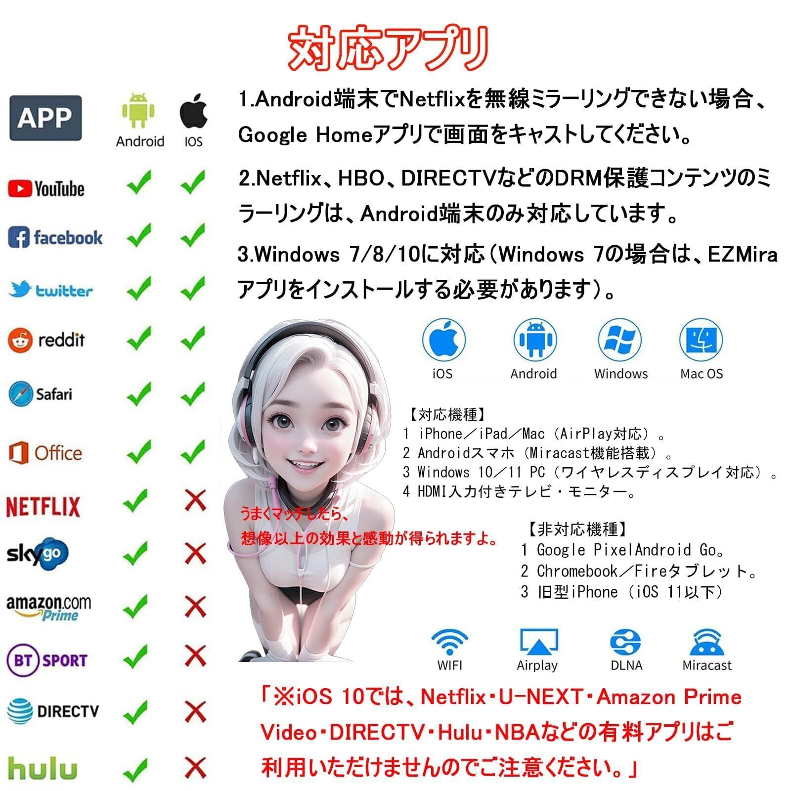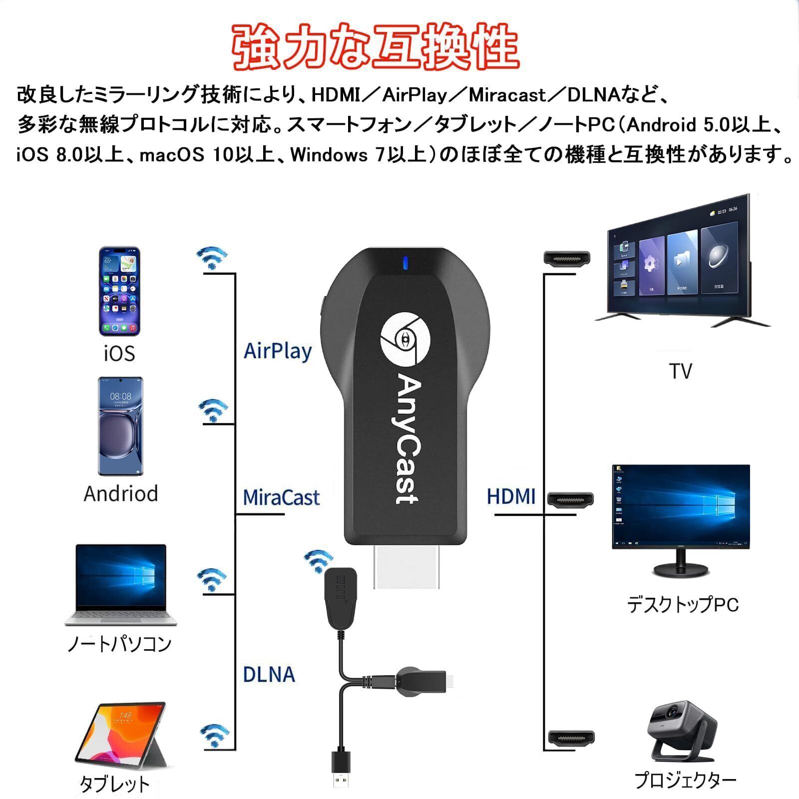 4K/1080P高解像度対応 HDMIミラーキャストは1080Pおよび4Kの高画質・高音質に対応。鮮やかな映像と滑らかな再生で、臨場感あふれる映像体験を提供します。全主要プロトコル対応Miracast、AirPlay、DLNA、EZmiraなど主要プロトコルに対応し、スマホ・タブレット・PCの画面を簡単にミラーリング可能。大画面での共有が簡単スマホの動画、写真、ゲーム、YouTube、オフィスファイルなどを、1080P/4Kの高画質でテレビに映し出せます。家族や友人と一緒に、大画面でコンテンツを楽しめます。