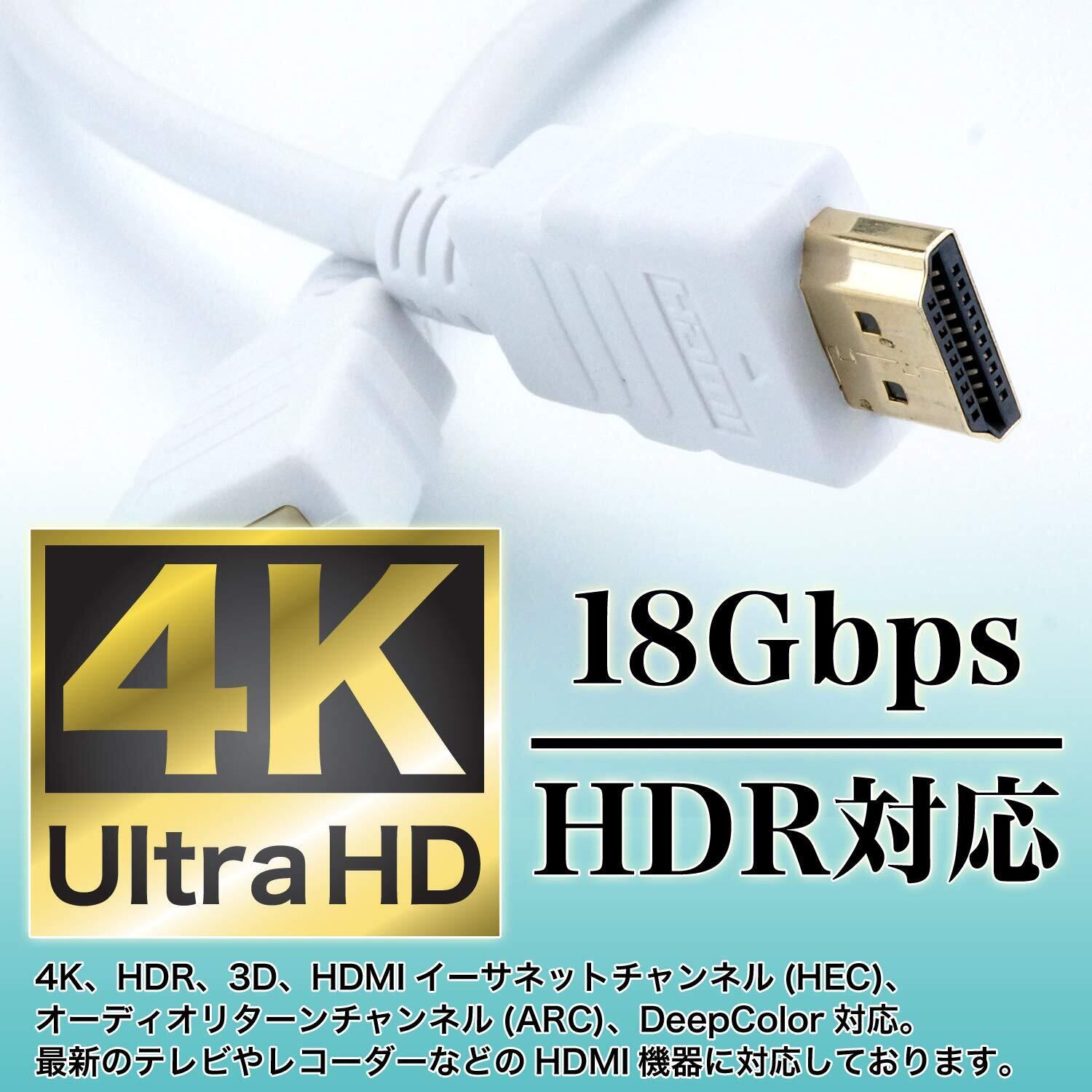 ■1本のケーブルで高品質な映像とサウンドを忠実に伝送HDMI端子を搭載しているテレビとレコーダー、ゲーム機などの接続に用います。1本のHDMIケーブルを繋ぐだけで、鮮明な映像とクリアな音声を簡単にお楽しみいただけます。■4K/60p(YCbCr4:4:4)対応Full HD(1920x1080)の約4倍の解像度にあたる4Kに対応しています。また、18Gbps高速伝送、HDR等の最新規格にも対応していますので、Ultra HD Blu-reyや4K対応ゲーム機での使用にも最適です。■3重シールドケーブル構造は強度の高い3重シールドでノイズを低減します。