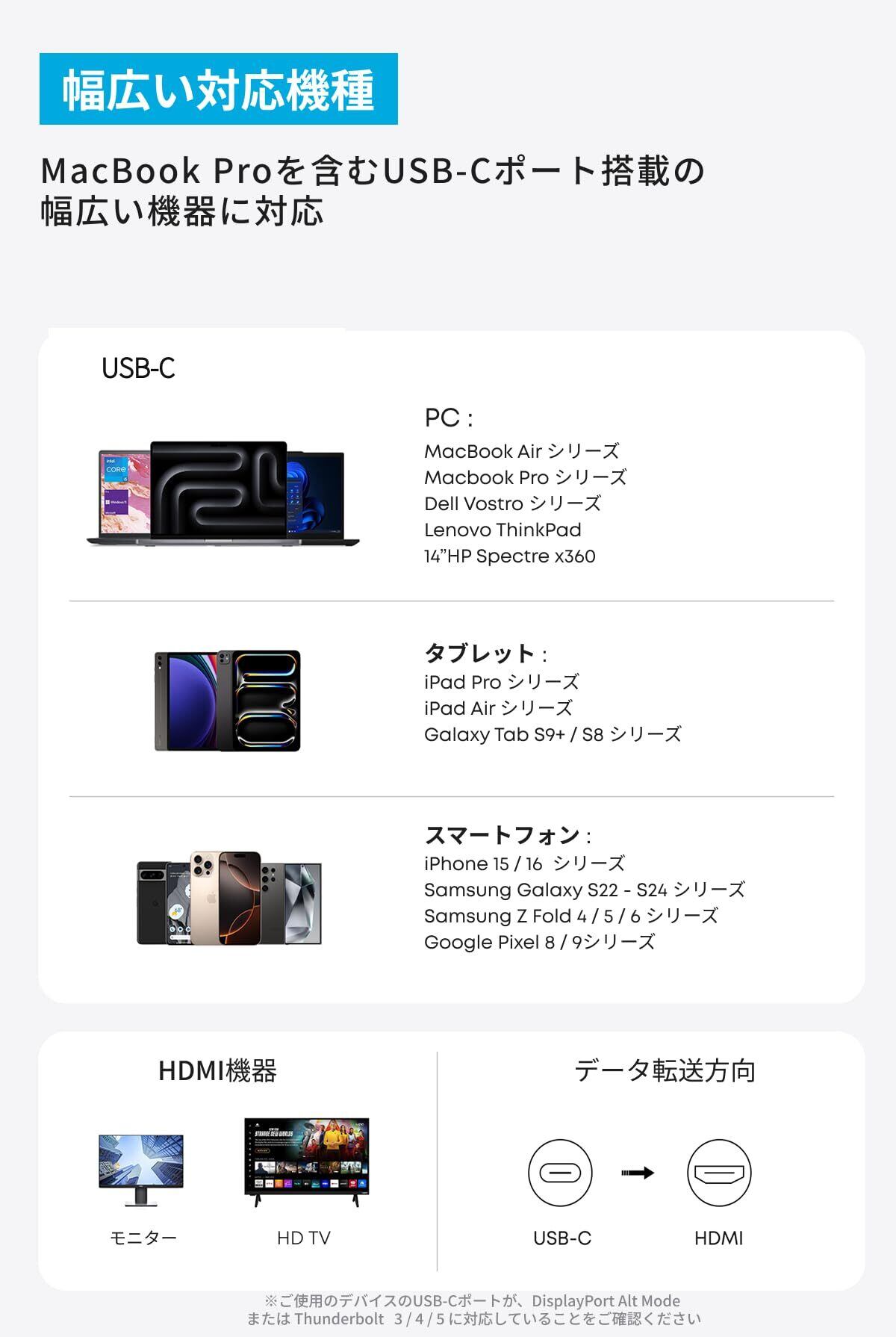 幅広い対応機種:MacBook Proを含むUSB-Cポート搭載の幅広い機器に対応。