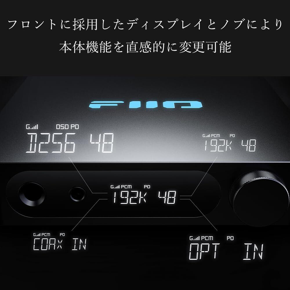 【フロントに採用したディスプレイとノブにより、本体機能を直感的に変更可能】K11では、FIIO製の据え置きヘッドホンアンプとして初めて、フロント部にディスプレイを採用いたしました。高コントラストで耐久性に優れたVAディスプレイにより、視認性が良く、焼き付きがなく常時点灯が可能となりました。サンプリングレート、音量、ゲイン、出力モードを視覚的に確認できます。 前面のノブを操作することで電源のオン/オフ、各入力の切り替え、メニュー操作、音量調整、その他の操作に使用されます。ノブを素早く2回プッシュすることでヘッドホン出力/RCA出力を排他的に選択でき、各出力では最後のボリュームを記憶可能です。アクティブスピーカーとの接続や、純粋なDACとして外部アンプへ接続をする場合にそれぞれ適切な出力モードを選択可能です。