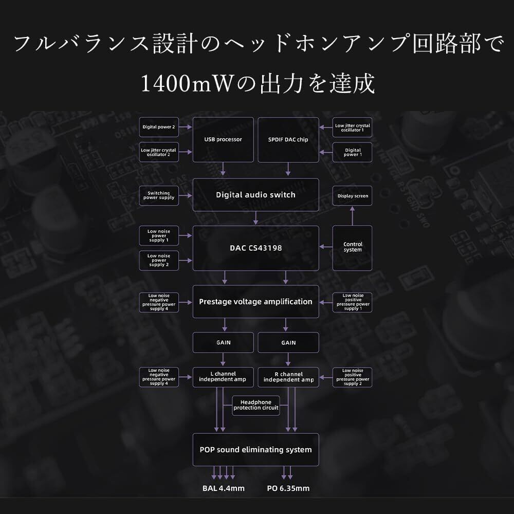 【フルバランス設計のヘッドホンアンプ回路部で1400mWの出力を達成】K11では、ヘッドホンアンプ回路のフルバランス構成を徹底し、左右のチャンネルあたり1基ずつ、合計2基搭載することによって、バランス出力で32Ω負荷時に最大1400mW、300Ω負荷時に最大250mWの高出力を実現しました。 さらに音質に悪影響を及ぼす電源ノイズを抑制するために、回路の各ブロックにそれぞれ独立した電源供給を行う電源供給回路設計を採用しています。12Vの外部電源から供給された電力は各ブロックを担当する低ノイズLDOによってクリーンな状態に保たれ、それぞれ適切な量に調整された上でコンポーネントに供給されます。