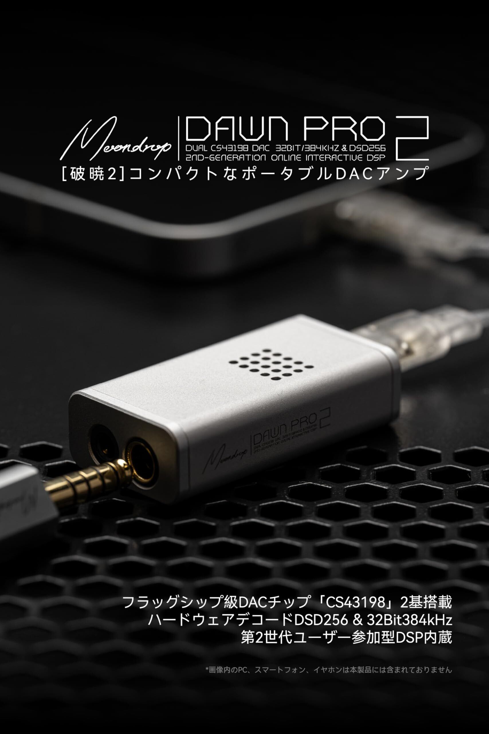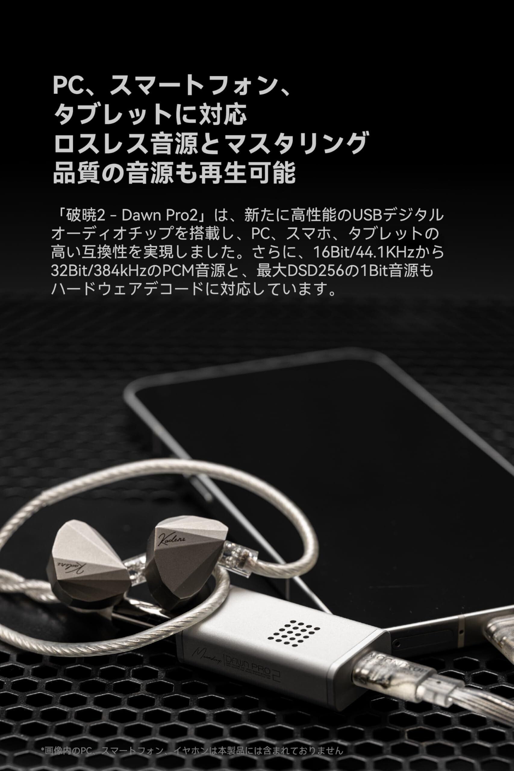 コンパクトなポータブルDACアンプ:【破暁 - DawnPro 2】は、新たに高性能のUSBデジタルオーディオチップを搭載し、PC、スマホ、タブレットの高い互換性を実現しました。さらに、16Bit/44.1KHzから32Bit/384kHzのPCM音源と、最大DSD256の1Bit音源もハードウェアデコードに対応しています。