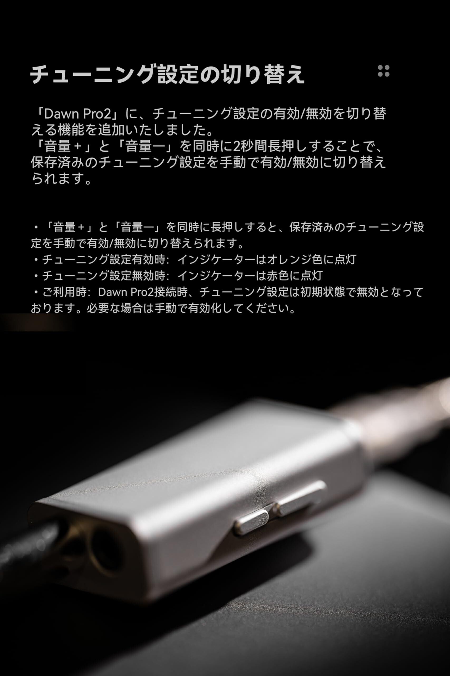 チューニング設定の切り替え:チューニング設定の有効/無効を切り替える機能を追加いたしました。「音量+」と「音量-」を同時に2秒間長押しすることで、保存済みのチューニング設定を手動で有効/無効に切り替えられます。「音量+」と「音量-」を同時に長押しすると、保存済みのチューニング設定を手動で有効/無効に切り替えられます。チューニング設定有効時:インジケーターはオレンジ色に点灯。チューニング設定無効時:インジケーターは赤色に点灯。【破暁 - DawnPro 2】接続時、チューニング設定は初期状態で無効となっております。必要な場合は手動で有効化してください。