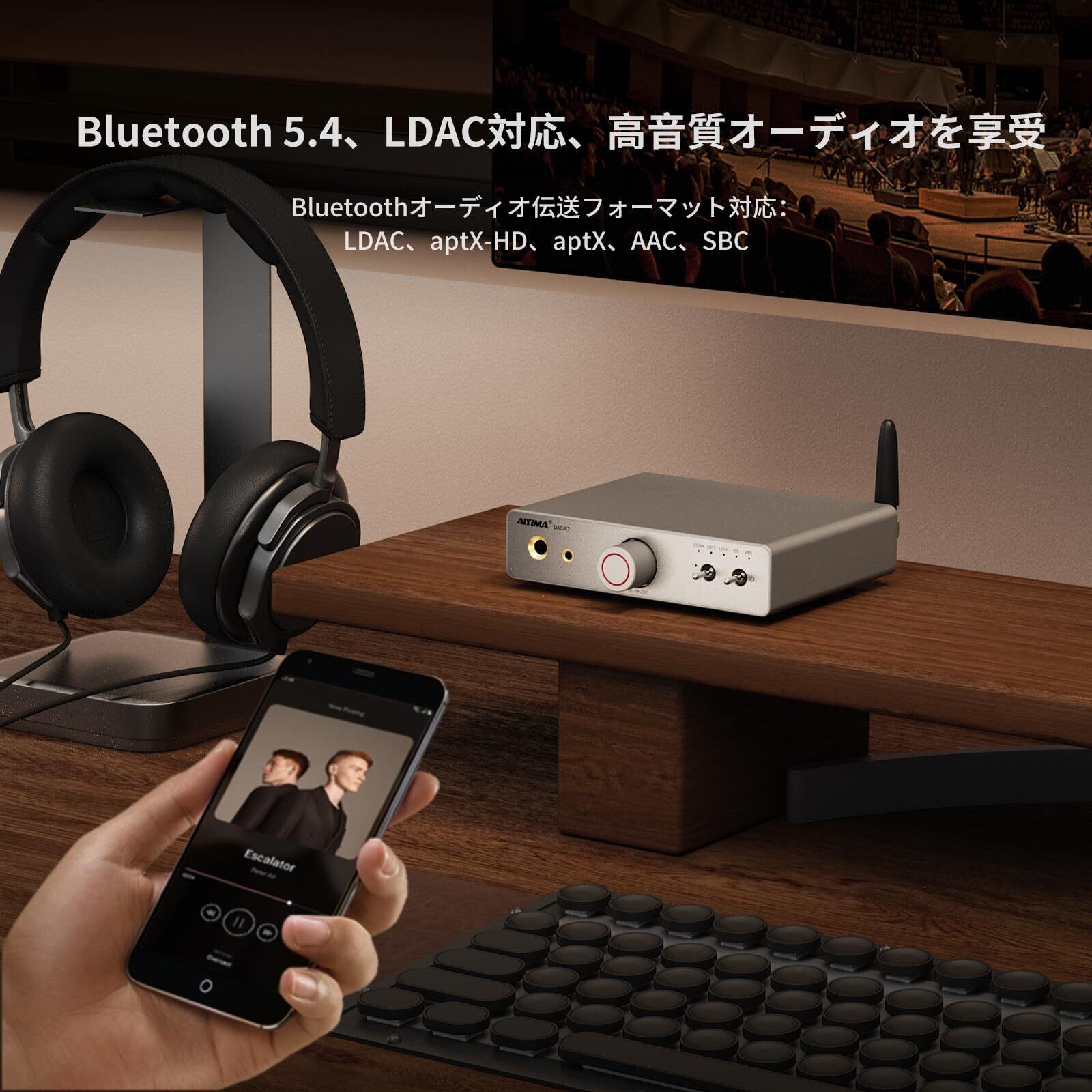 【Bluetooth 5.4対応】:AIYIMA DAC-A7はBluetooth 5.4を採用し、内蔵のQualcomm QCC3084オーディオチップにより、最大96kHz/24bitの高解像度オーディオ伝送をサポート。LDAC、aptX-HD、aptX、AAC、SBCを全面的に対応し、高忠実度ワイヤレスリスニング体験を実現。