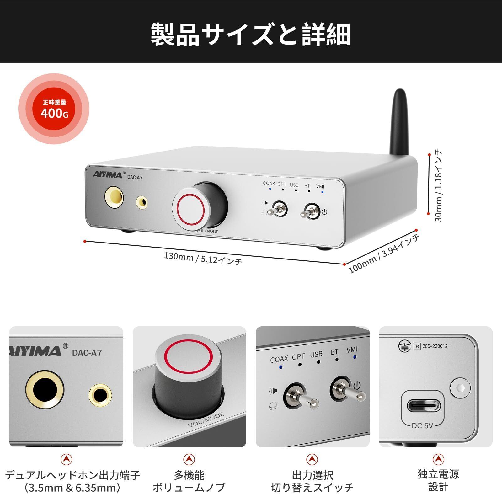 AIYIMA DAC-A7 Bluetooth 5.4 デコードヘッドホンアンプ 3.5mm+6.35mmデュアルヘッドホン出力 ES9038Q2M(Hi-Fi級デコードチップ)+ QCC3084(高スペックBluetoothチップ)対応 LDAC, aptX-HD, aptX, AAC, SBC, 24bit 192kHz DAC ヘッドホンアンプ ホームオーディオシステム