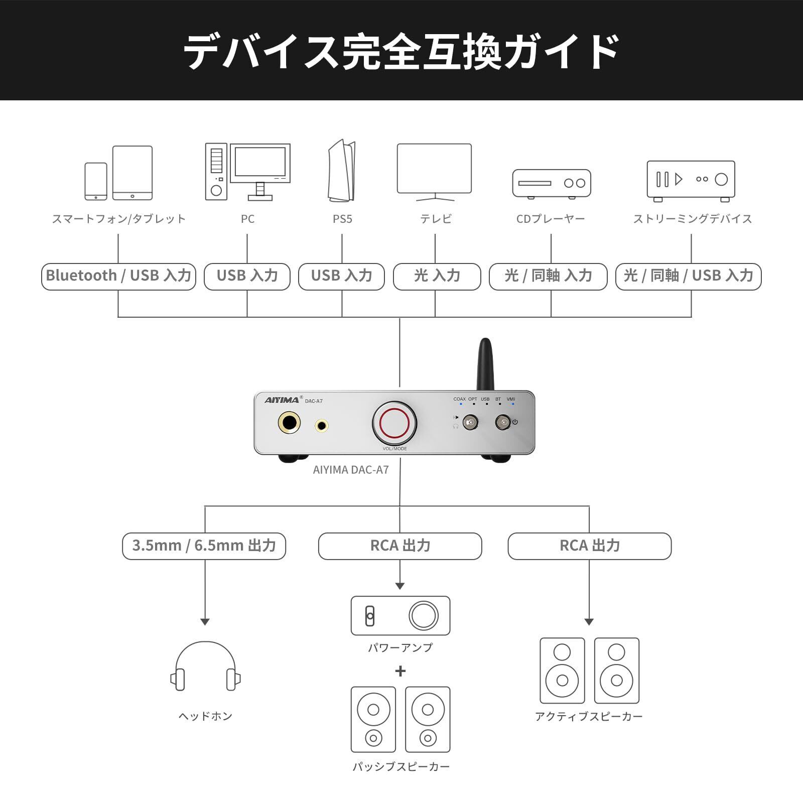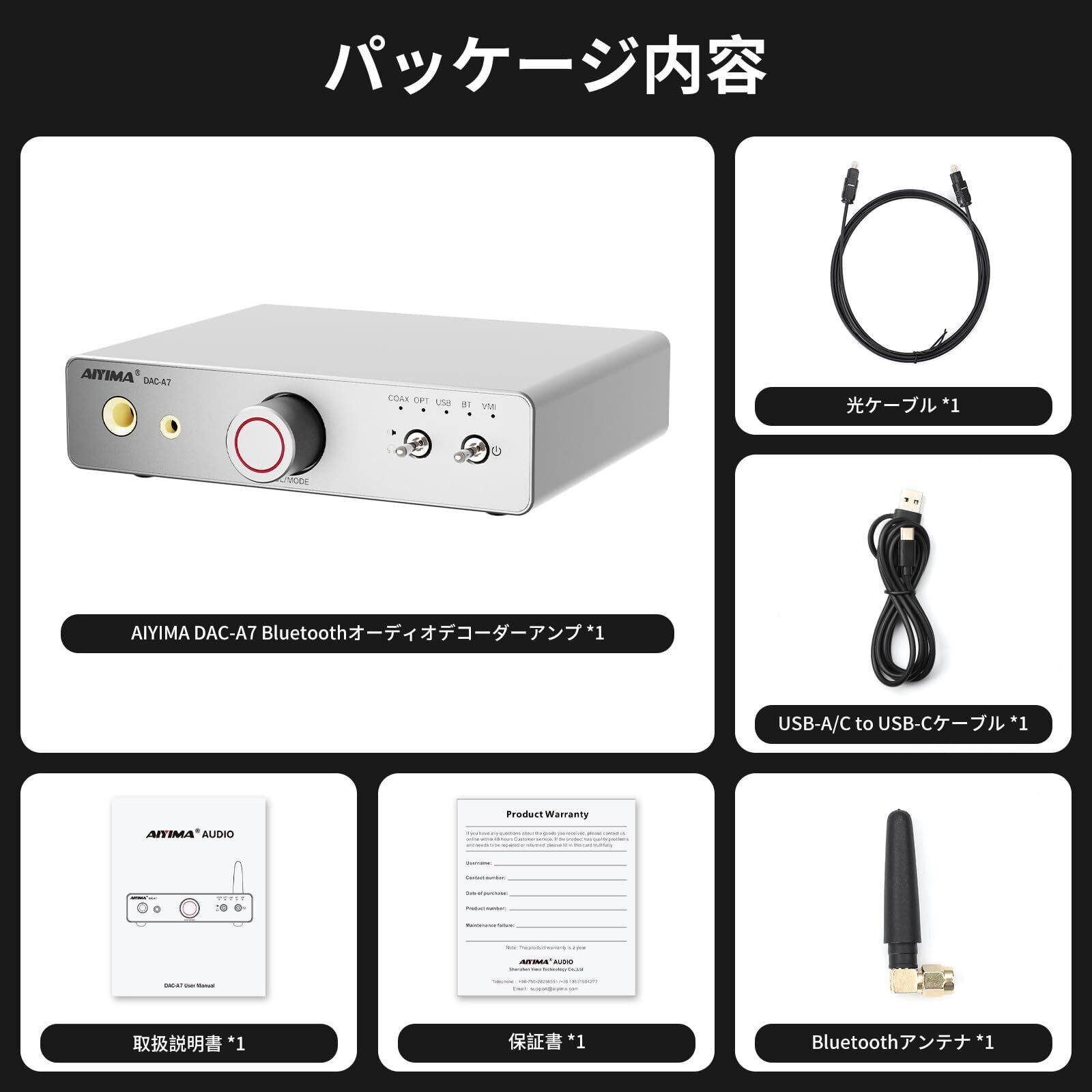 【パッケ-ジ内容】AIYIMA DAC-A7 Bluetoothオーディオデコーダー&アンプ *1,光ファイバーケーブル *1,USB-A/C to USB-Cケーブル *1,取扱説明書 *1,書 *1,Bluetoothアンテナ *1 ,24ケ月安心と迅速な力スタマ-サ-ビス。
