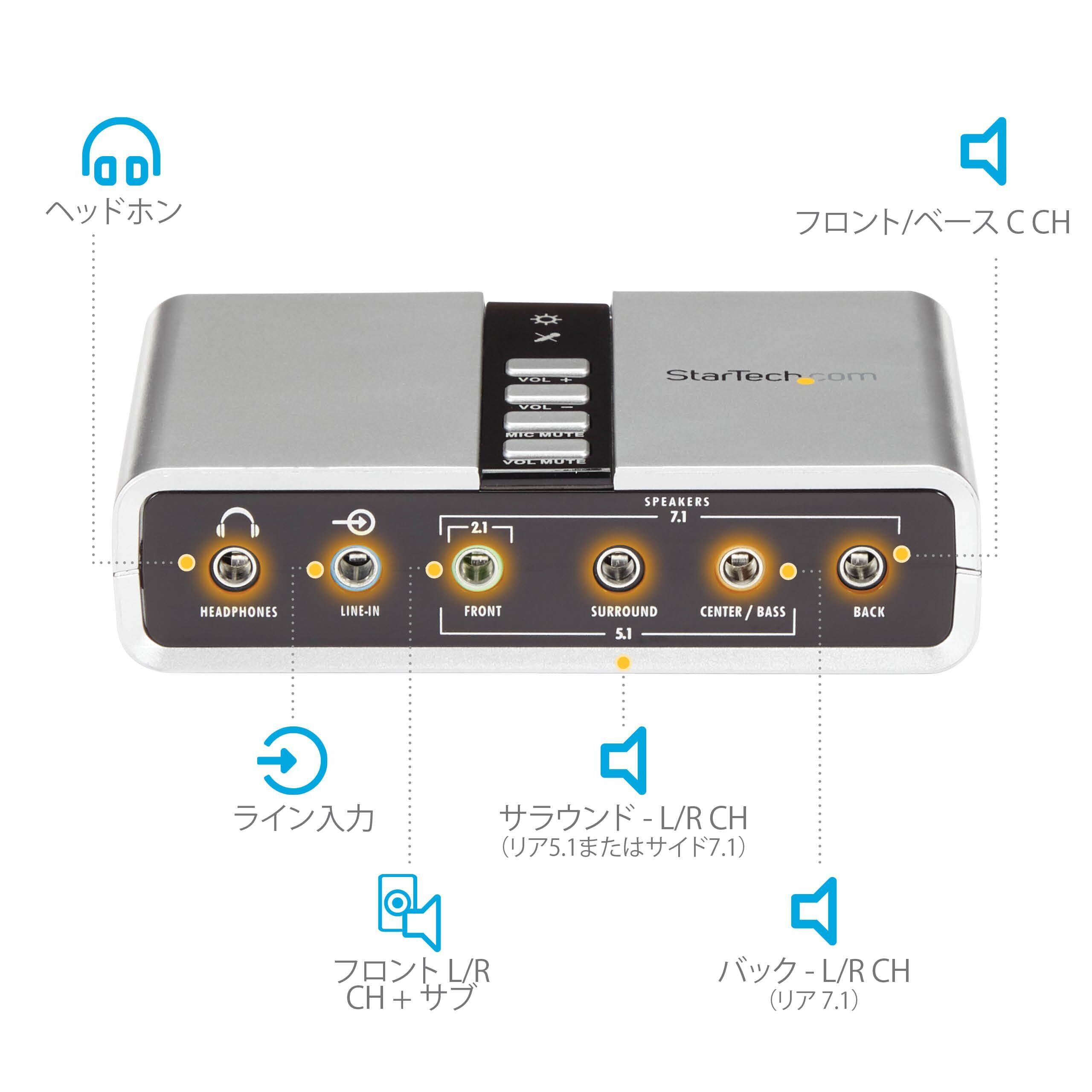 PCのサウンドをアップグレード:ステレオ - 7.1chオーディオ用途でアナログ・デジタル音声出力に対応。デスクトップ/ノートPCに搭載のオーディオ機能をアップグレードできるバスパワーUSBアダプター。1m USBケーブル付属