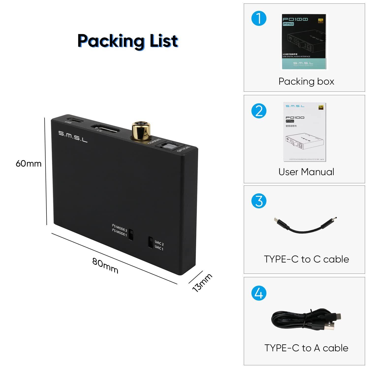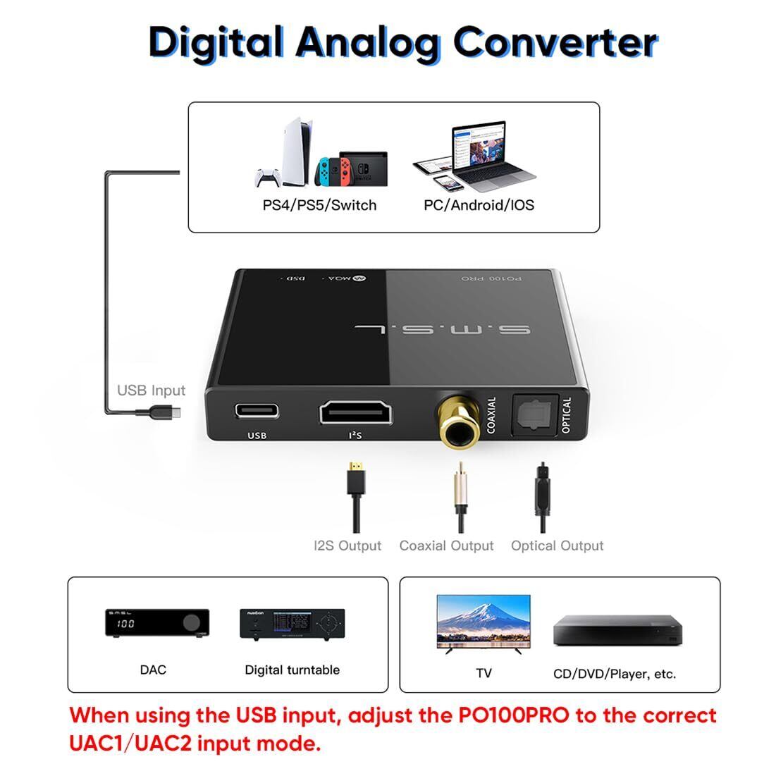 SMSL PO100 PRO MQA DDC XMOS XU316 デジタルアナログ オーディオコンバーター Type-C USB 入力 IIS/Optical/Coaxial出力 電話/TV/PS3/PS4/PS5用小型携帯用 USB インターフェイス コンバーター