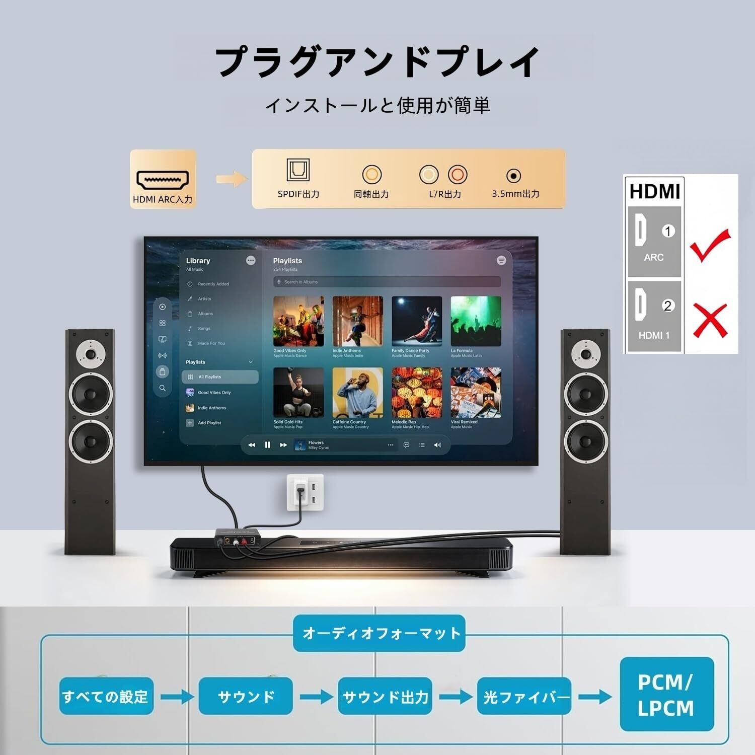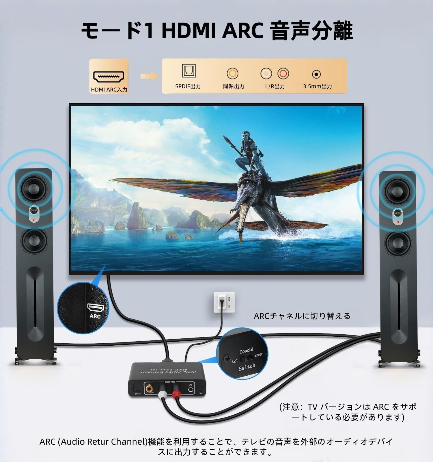 【トラブルシューティング】 音声が出力されない場合は、以下の点を確認:①本体LEDの点灯状態②テレビのARC対応有無③テレビ設定での音声出力先が「HDMI ARC」になっていること。※HDMI 1.4規格(AWG26)のケーブルを使用しているか確認。低品質やHDMI 1.3ケーブルはARC非対応。これらをチェックすればほとんどの問題が解決します。