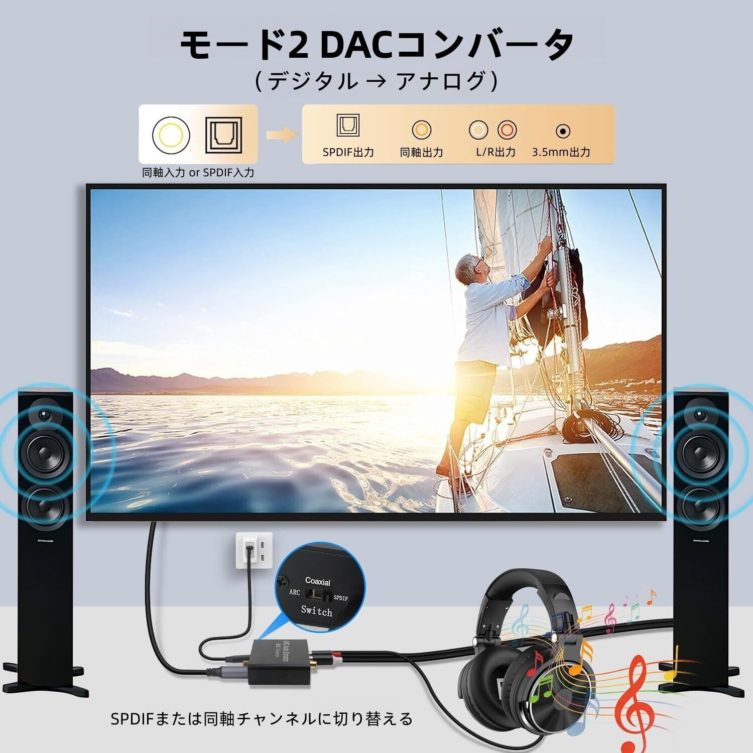 【DAC付き音声分離器】 同軸および光デジタル(Toslink/SPDIF)オーディオ入力をアナログステレオに高音質変換。PCM/LPCM信号をアンプ・ヘッドホン・スピーカーに最適なアナログ信号へリアルタイム変換します。パネル上の切替スイッチで、光入力モードと同軸入力モードをワンタッチで切り替え可能。(※PCM/LPCM信号のみ対応。ドルビーデジタル等のデコード機能はございませんのでご注意ください。)