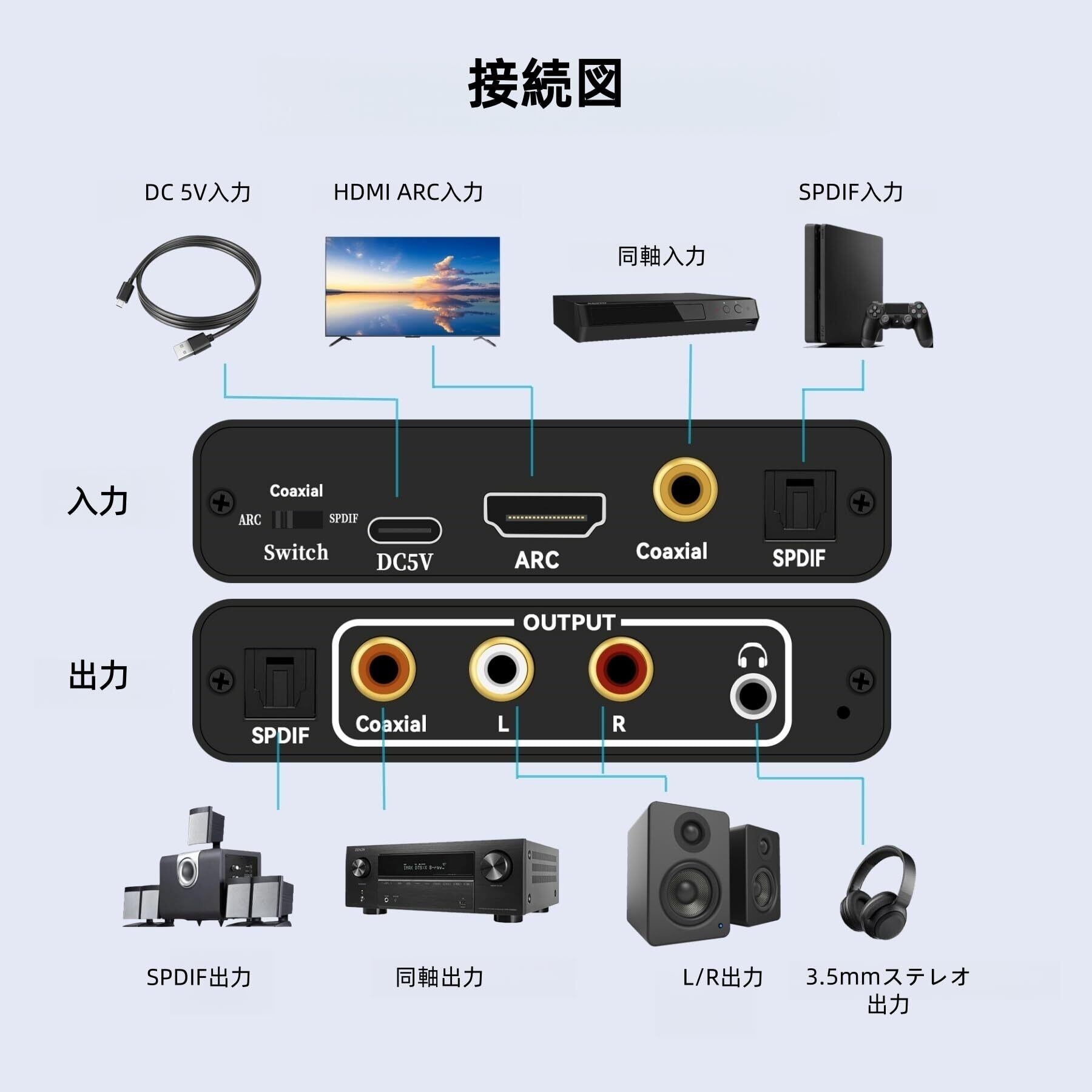 【多様な音声同時出力可能】接続機器に応じて最適な出力方式を選択できます。光デジタル/SPDIF、同軸(Coaxial)、3.5mmステレオ、RCA(L/R)オーディオ信号の同時出力をサポートしています。取り付けも操作も簡単。この完璧なオーディオコンバーターDACとHDMI ARCアダプターエクストラクターを使えば、サウンドバー、アンプ、スピーカー、ヘッドホンなどに音声を出力できます。