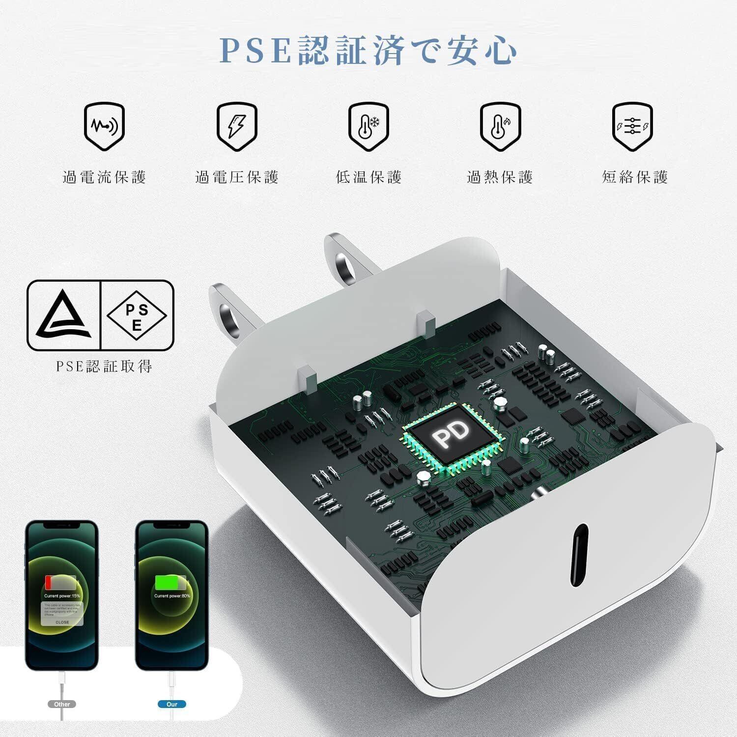 【MFi&PSE認証済で安心・安全】当社のUSB Type-C PD20WアダプタはPSE認証を取得し、厳格な品質管理を通じて、更に過熱、過充電、過放電および回路ショート防止など給電保護機能搭載しており、iPhone/iPadデバイスに自動的に必要な電流に適合し、迅速かつ安定してデバイスを充電できます。