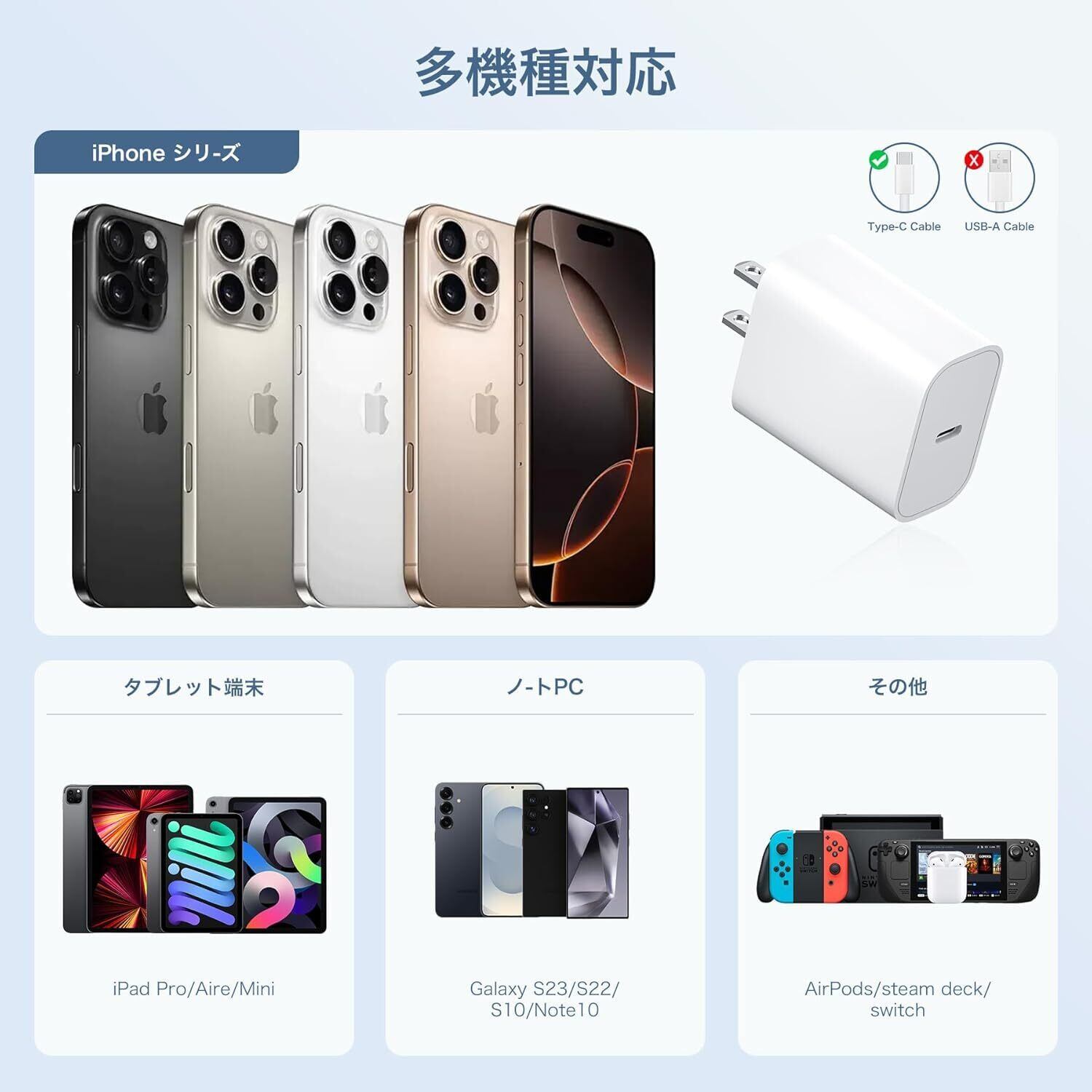 iPhone 16/17/16 Pro/16 Pro Max/16 Plus,iPhone 15/15 Pro/15 Pro Max/15 Plus, USB Type C, iPad mini 第6世代、Air 第5/4世代、Pro 11inch、Pro 12.9inch 第5/4/3世代,その他USB-C機器対応