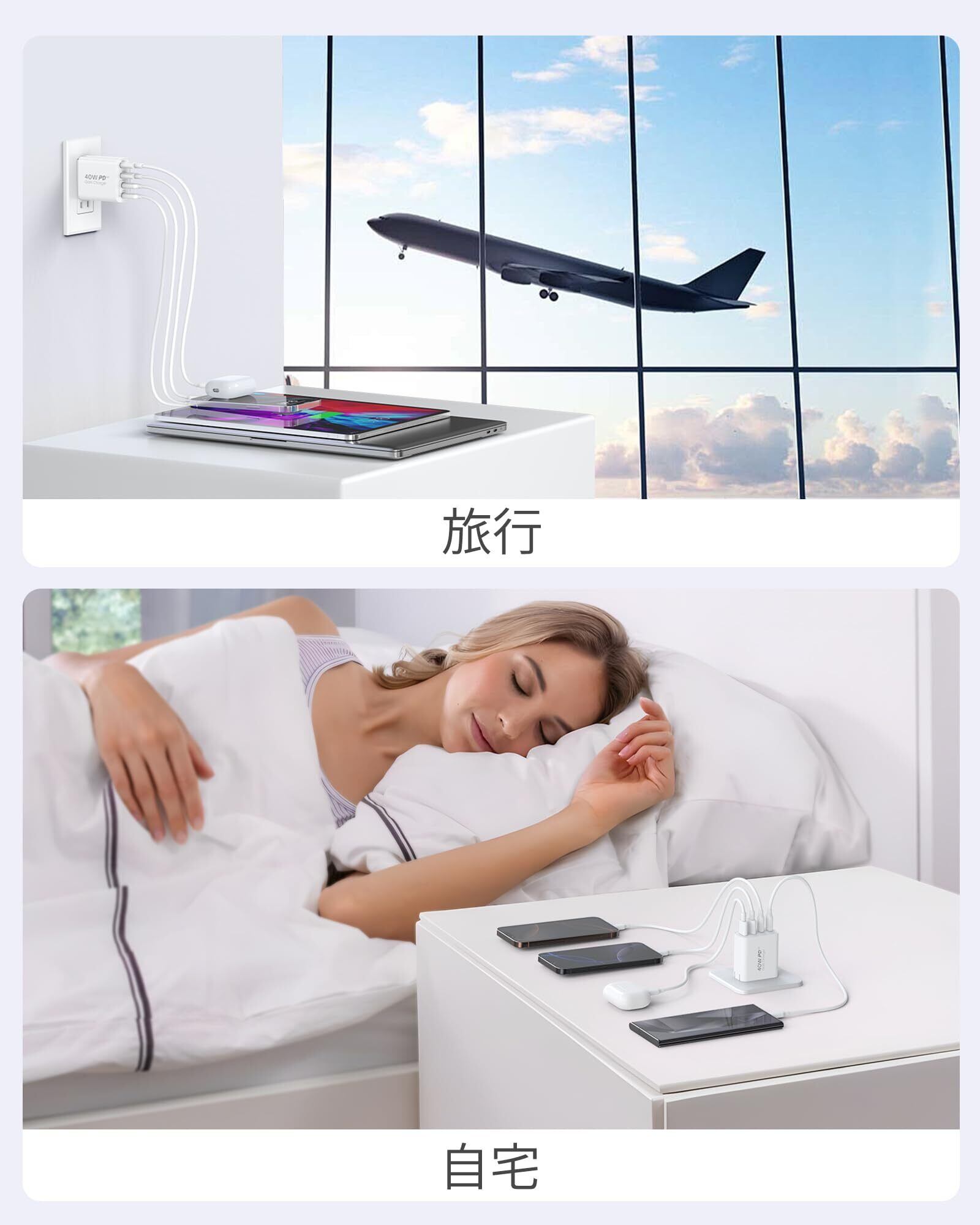 【旅行に最適な折り畳み式充電器】折りたたみ式プラグを採用し、どこにでも気軽に持ち運ぶことができます。充電器4ポートを搭載し、4台のデバイス同時充電に対応。 4in1充電器設計、外出時の携帯性はもちろん、オフィスや自宅でのデスクが一気にすっきり!複数デバイス所有者にこそ選ばれる1台です。さらに、この携帯式充電器は100-240Vの広電圧対応で、ビジネス出張や海外旅行に最適な海外旅行便利グッズです。