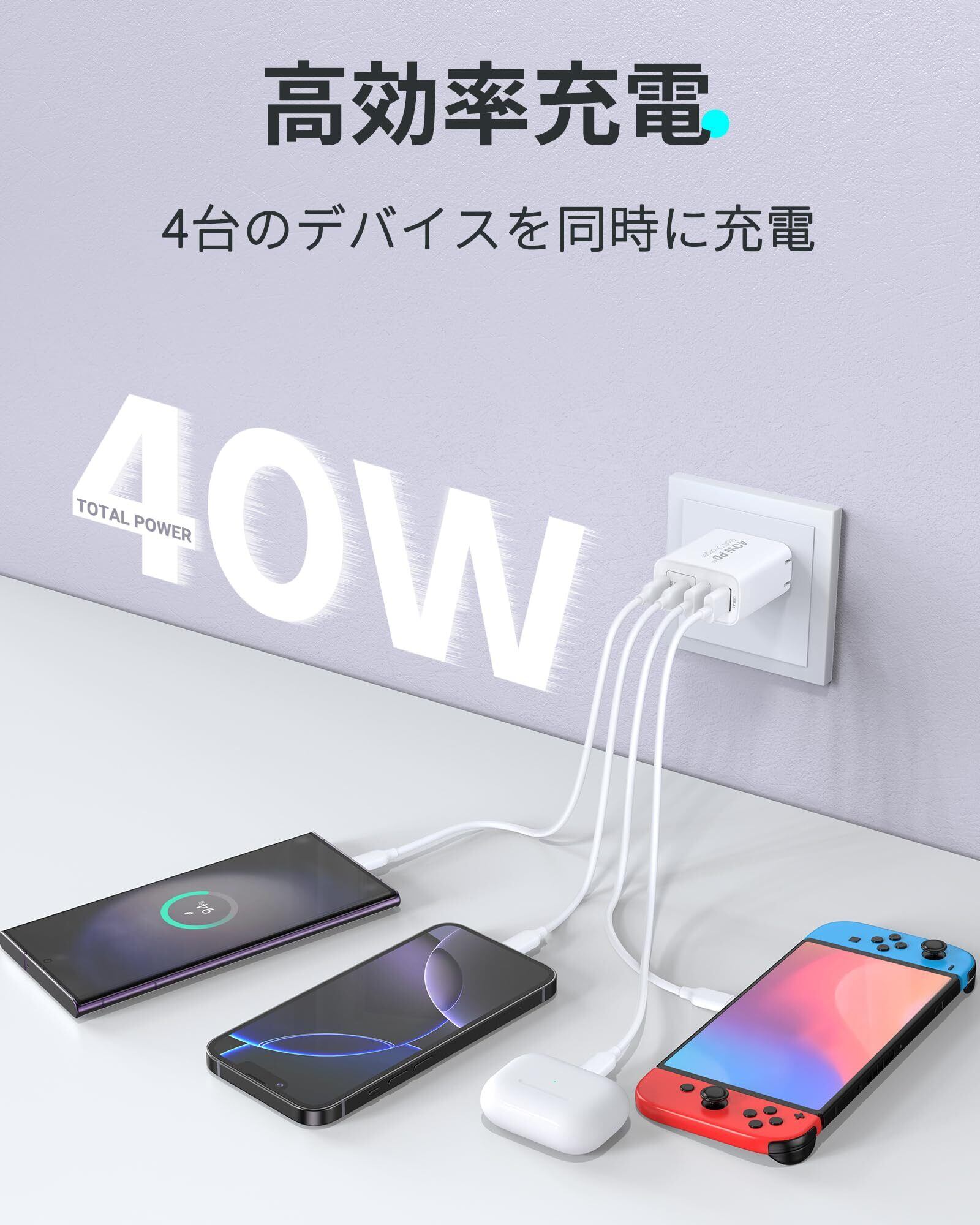 合計40W 急速充電器 タイプc 充電器 4 IN 1 USB コンセント四台同時充 電 スマホ 充 電器 iPhone iPad Androidその他各種機器対応 白色
