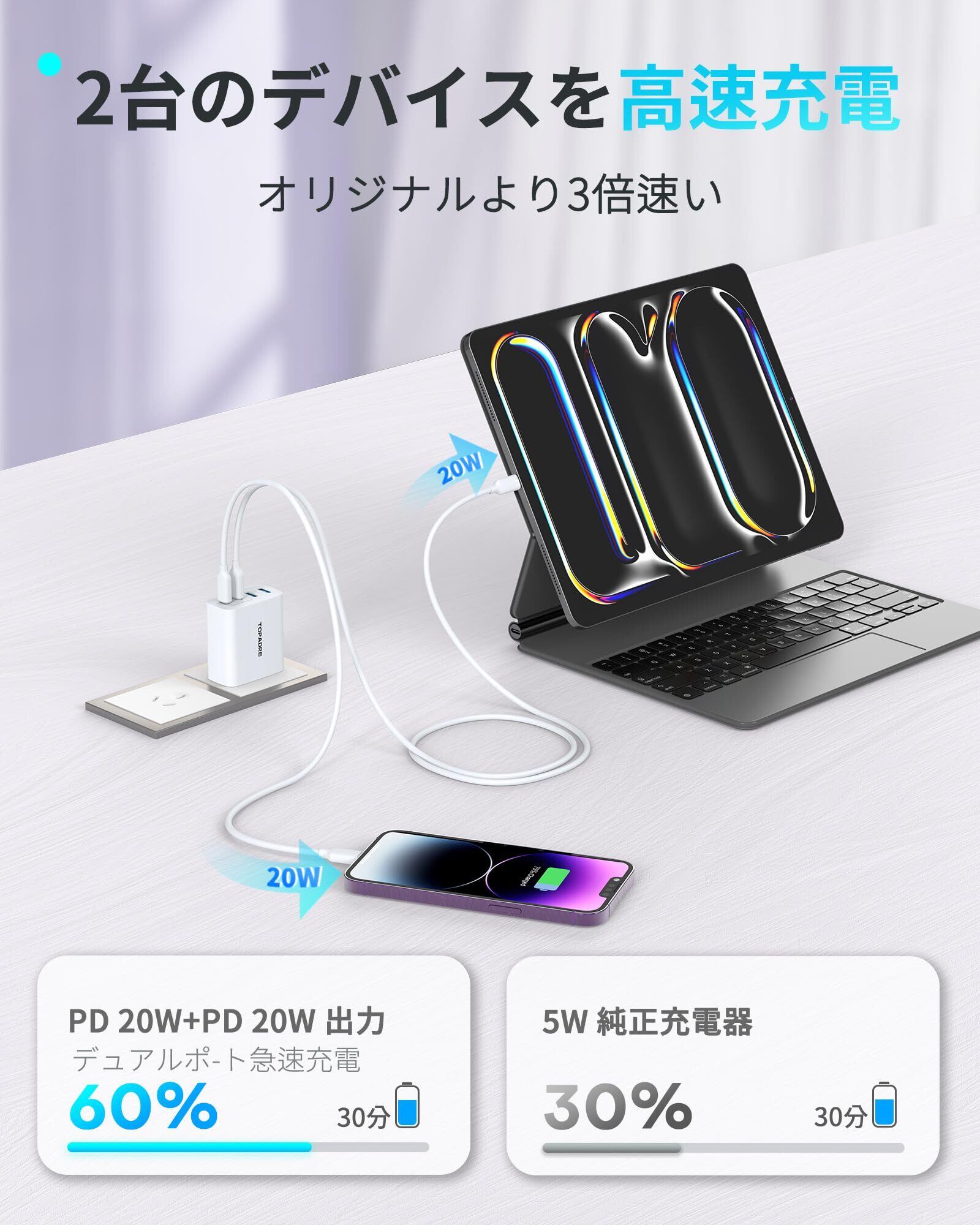 【合計40W USB充電器|2ポート同時高速充電対応】 このコンパクトな Type-C充電器 は、USB PD対応の2つのタイプc ポートを搭載し、2ポート利用時にも1つのポートから最大20W、2ポート合計最大40Wの出力が可能(USB-C1+USB-C2=20W+20W)、わずか 30 分で iPhone デバイスを 0% から 55% まで充電できます。ご注意:複数デバイスを同時接続時、新しいデバイスを接続/抜去すると、充電器はスマート保護システムにより各ポートの電力を自動再分配します。この際、電力変化によるデバイスへの影響を防ぐため、一時的な断電が発生する場合がありますが、充電はすぐに復旧します。全てのデバイスを安全に保護するための正常な動作プロセスです。