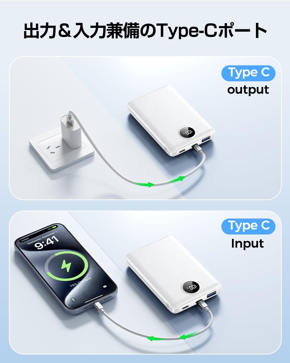 【LEDライト機能付き 】LED残量表示が搭載され、見やすいライトがつき、電源ボダンを押すと、バッテリー残量と入出力状態を一目で確認することができます。