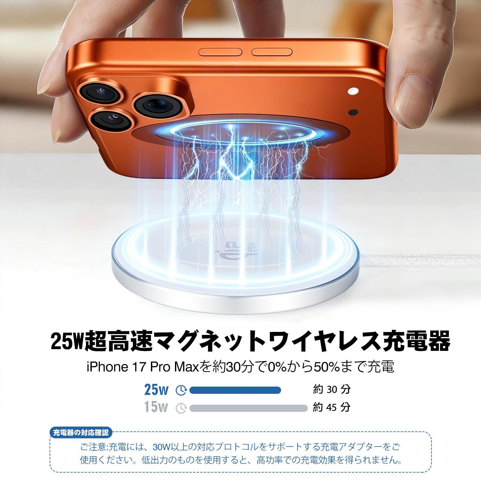 【Qi2対応 25W急速充電】FEEKI 新型MagSafe充電器は、Qi2.2規格へとアップグレードし、WPC公式認証を取得しました。技術面における安全性と効率性は国際基準に適合しており、従来のQi2 15W充電器と比較して最大25W(約70%向上)の高速充電を実現。MagSafe対応により、iPhone 17 を約30分で0%から50%まで充電可能な性能を誇り、充電体験を大きく向上させます。※最大充電効率を得るには、35W以上の電源アダプタのご使用をお勧めします(アダプタは付属しておりません)。
