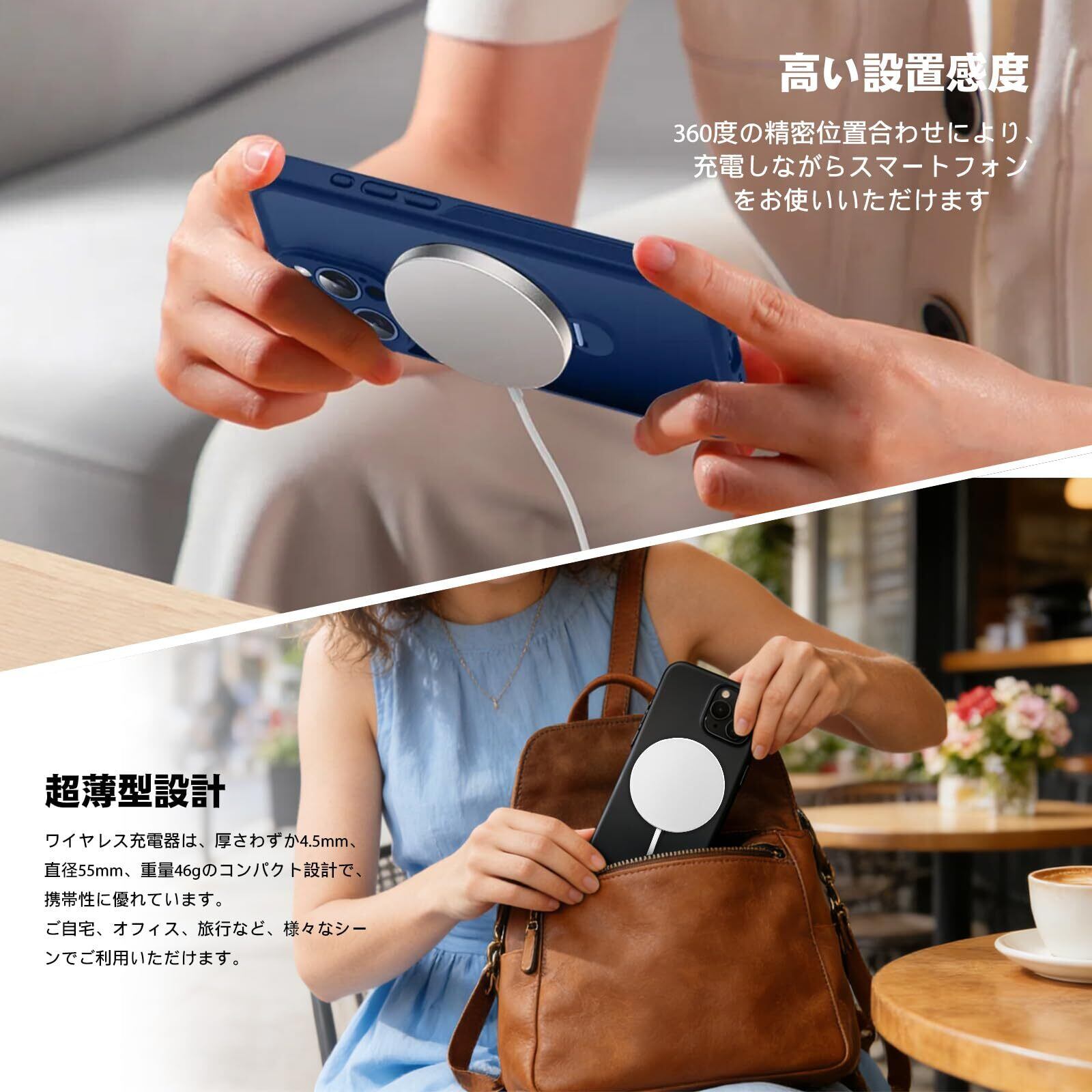 【持ち運びが便利】高強度の強化ガラスと航空級アルミ合金素材を採用しています、優れた熱伝導特性を実現。内部回路基板と絶縁されたサスペンション構造を採用することで、使用時の過熱を防止。安全性を確保しつつ、スマートフォンのバッテリー寿命延伸に貢献する設計となっております。金属フレームが高級感を与え。超薄型設計のワイヤレス充電器は、厚さわずか4.5mm、直径55mm、重量46gのコンパクト設計で、携帯性に優れています。ご自宅、オフィス、旅行など、様々なシーンでご利用いただけます。充電器にiPhone/AirPodsを置くだけで自動的に吸着して充電が始まります。磁気充電タイプでピッタリとつき、充電中の落下を防止できます。