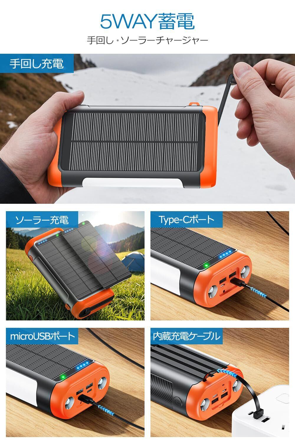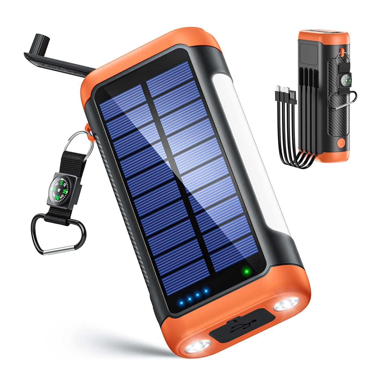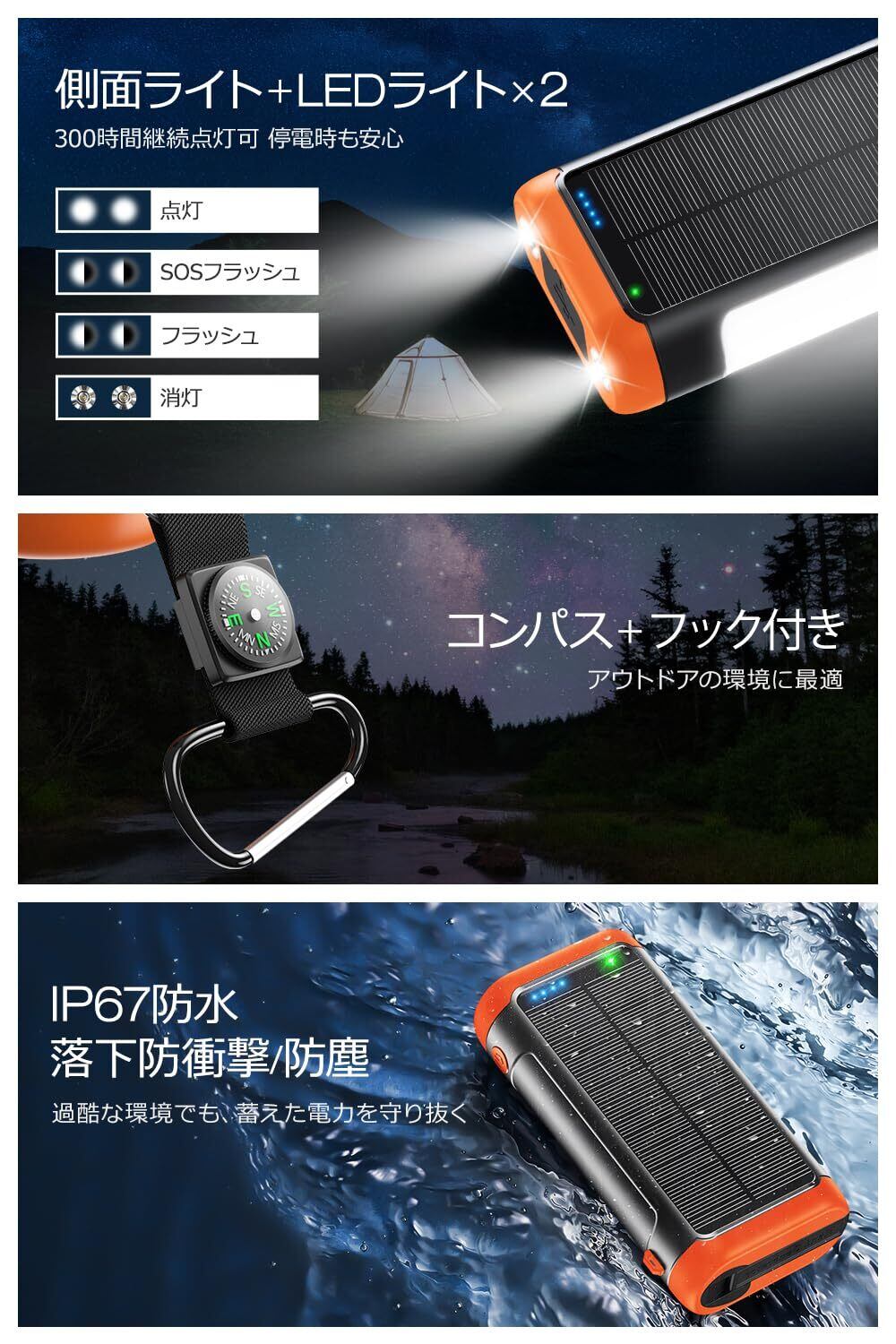 ソーラーモバイルバッテリー 22.5W/PD18W 急速充電 4本ケーブル内蔵 6台同時充電 ソーラーチャージャー 側面ライト+LEDライト付き IP67防水 防塵 耐衝撃 5way蓄電 モバイルバッテリー ソーラー充電器 コンパス搭載 フック付き 携帯便利 アウトドア/旅行/地震/災害/緊急用 防災グッズ (オレンジ)