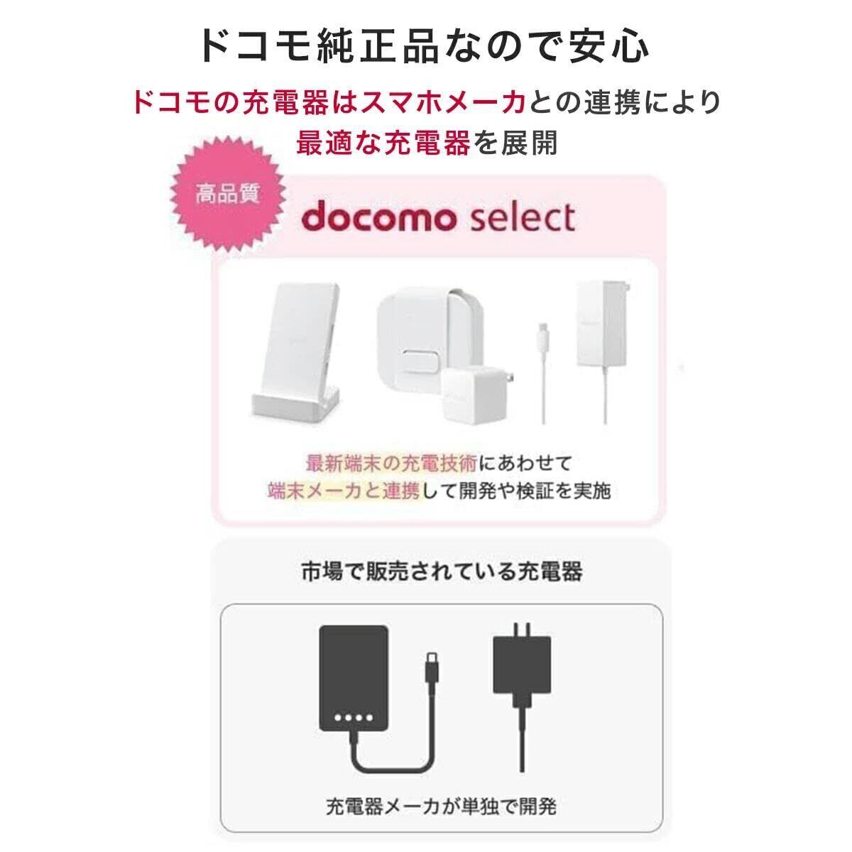 ■安全性・安心機能:ドコモあんしん・あんぜん設計が施されています。・ショート対策:万が一ショートした場合でも給電を抑え、発熱や発火を防ぎます。・通信影響対策:ノイズを抑えることで、スマートフォンの電波感度の劣化を抑制します。・温度保護機能:高温になった際には自動で給電をストップします。・異常検知機能:専用ICを搭載し、過電流や過電圧の異常を速やかに検知して、発熱や発火を防ぎます。