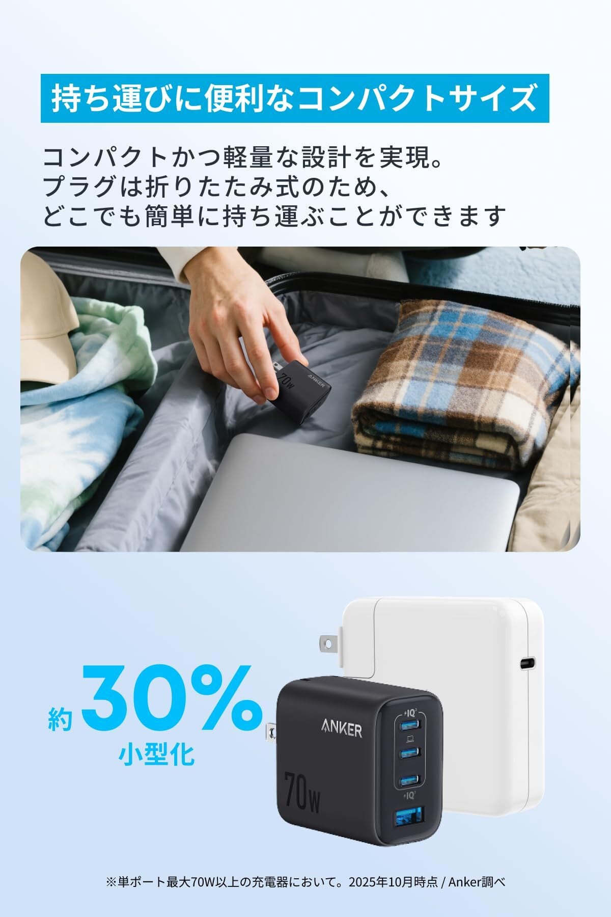 持ち運びに便利なコンパクトサイズ:コンパクトかつ軽量な設計を実現し、プラグは折りたたみ式のため、どこでも簡単に持ち運ぶことができます
