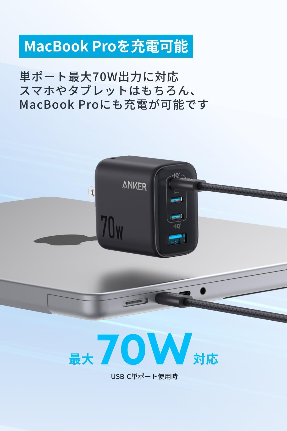 MacBook Airを急速充電:単ポート最大70W出力に対応。スマホやタブレットはもちろん、MacBook Airにも急速充電が可能です。
