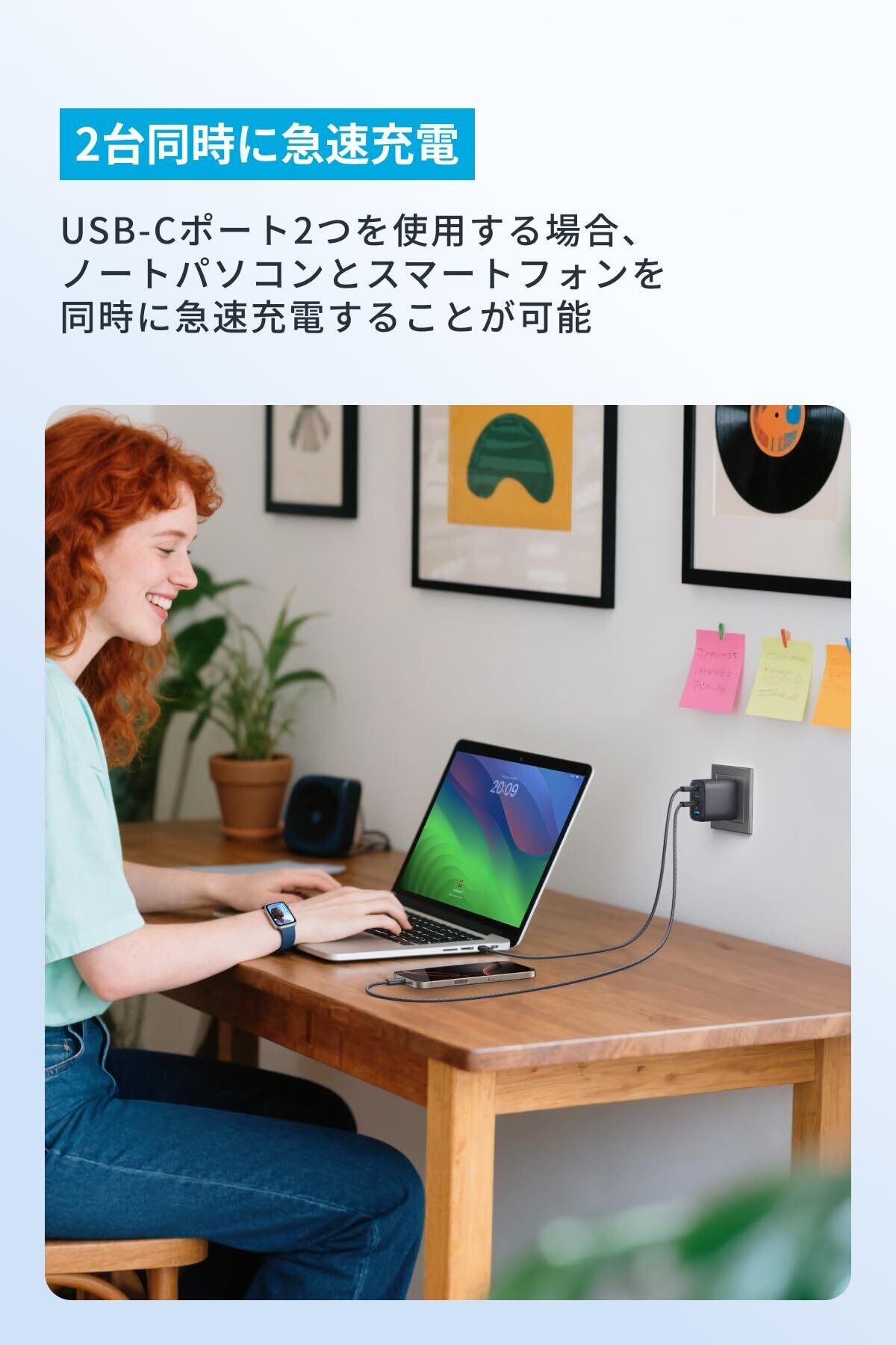 2台同時に急速充電:2つの USB-Cポートを同時に使用することで、ノートパソコンとスマートフォンを同時に急速充電できます