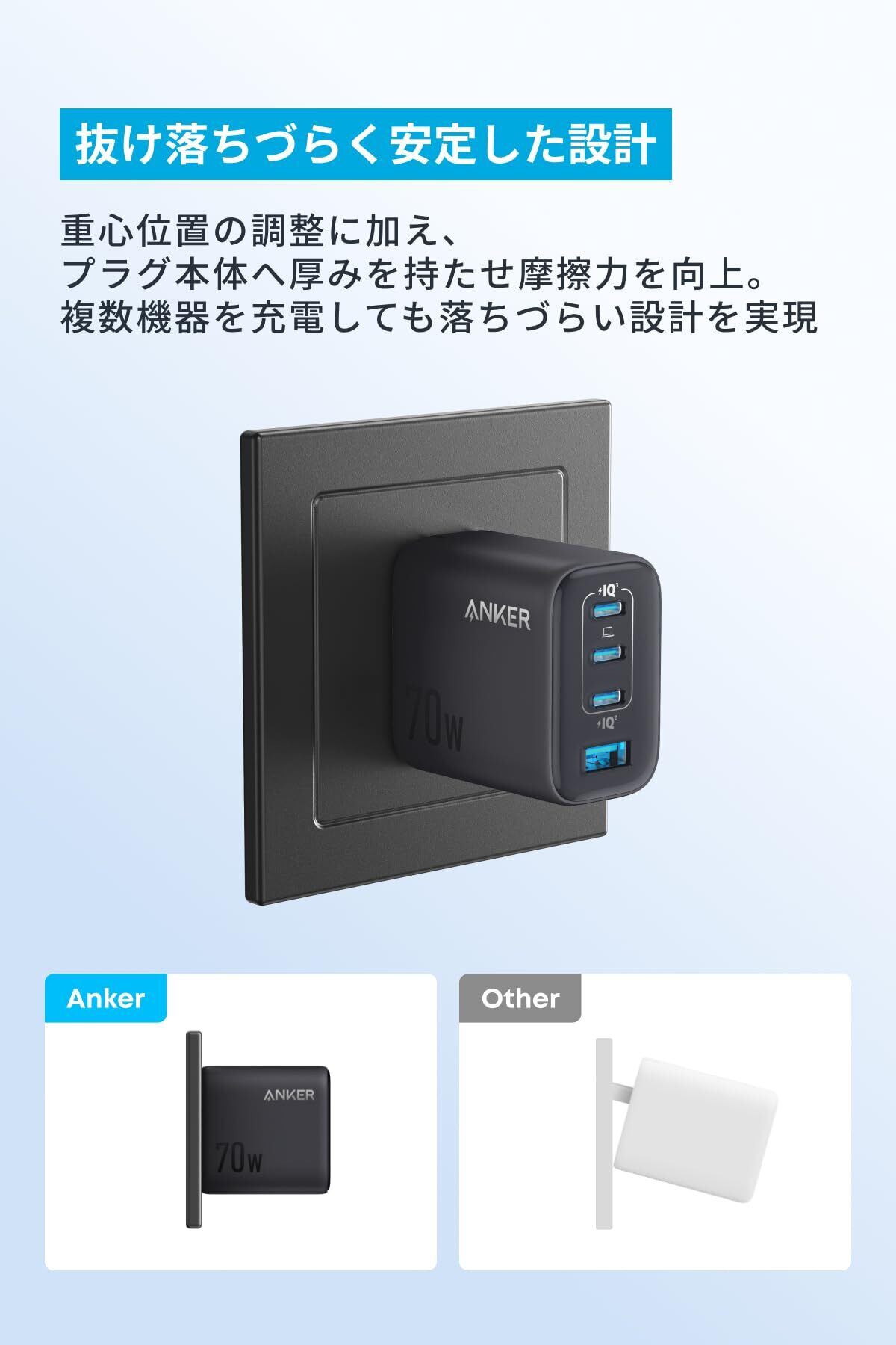 抜け落ちづらく安定した設計:重心位置の調整に加え、プラグ本体へ厚みを持たせ摩擦力を向上させ、複数機器を充電しても落ちづらい設計を実現