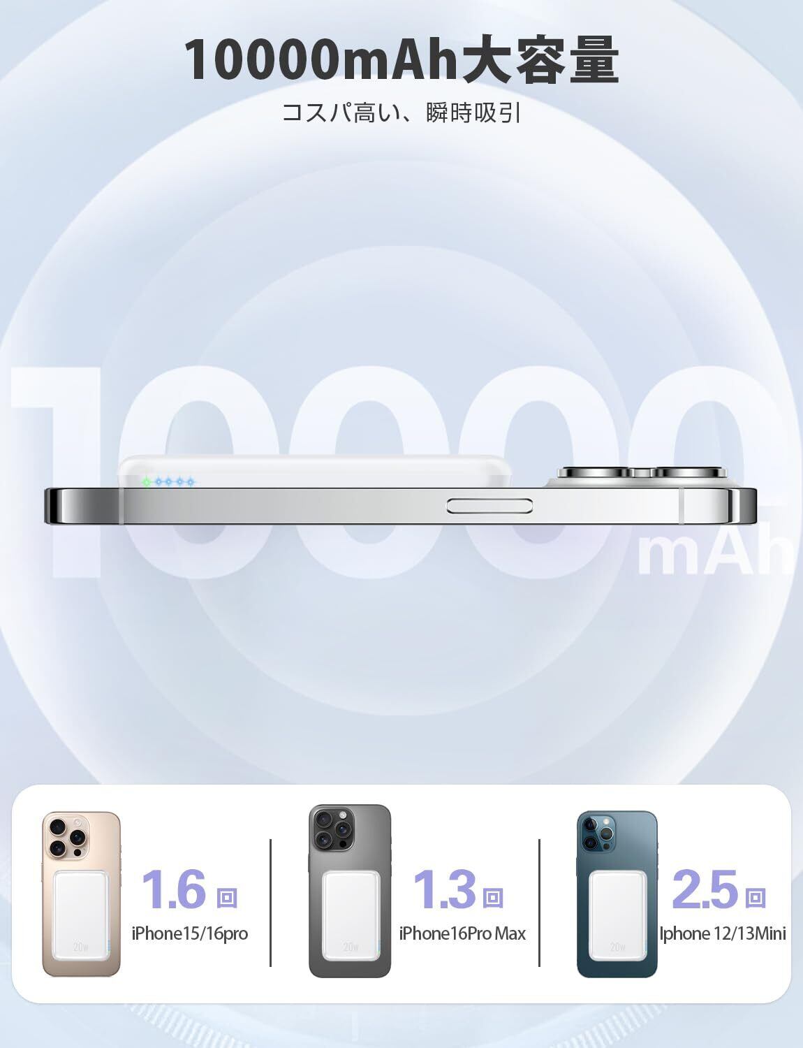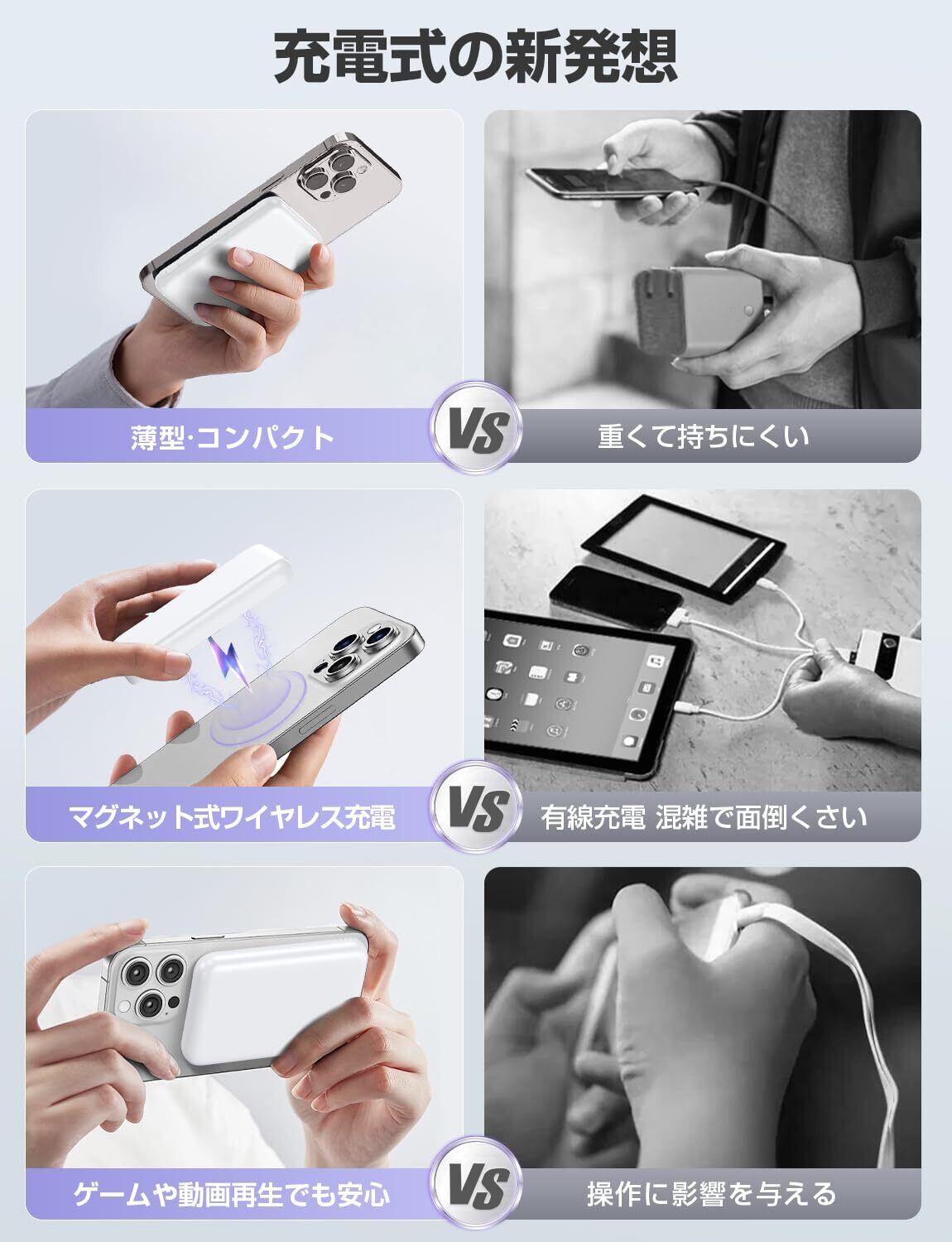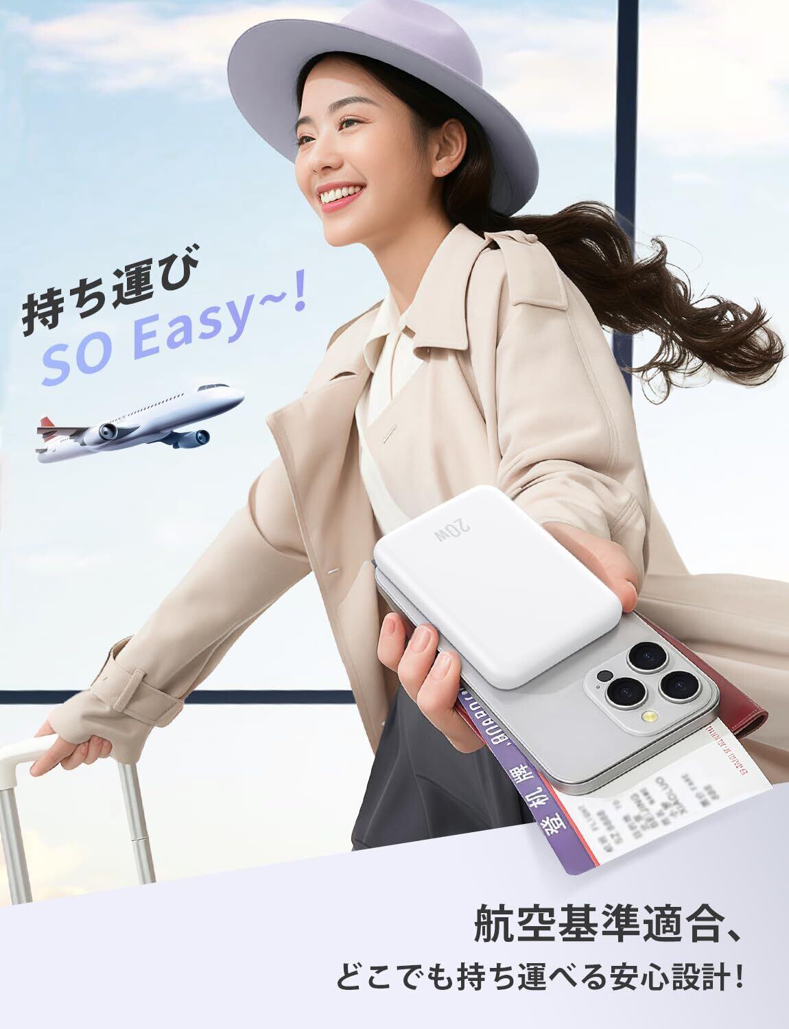 【10000mAh大容量・飛行機内に持ち込み可能】10000mAh大容量のことでiPhone 16/16ProとiPhone 15/15 Proを約1.5回充電でき、iPhone 14/14 Proを約1.8回充電もできます。またバッテリーの色はホワイト系で触っても心気持ちがよく、高級感も溢れます。その上、スマホゲーム好きな方に手の動きを邪魔なケーブルもなくなり、の「W5 PRO」をポッとつけると、ゲーム中スマホのバッテリーの不足も心配なく、ご自分のゲーム実力も邪魔になりません。さらに、現在世界段々安定なことで、✈️海外出張や旅行の方も増えると思い、10000mAhのことで機内への持ち込みも可能です。また世界各国でも安心してご利用ことができ、充電器をもち歩いてなくても、いつでもどこでも電量の心配はいりません。