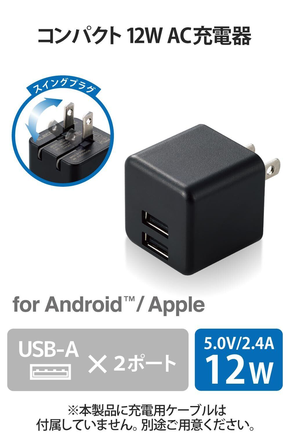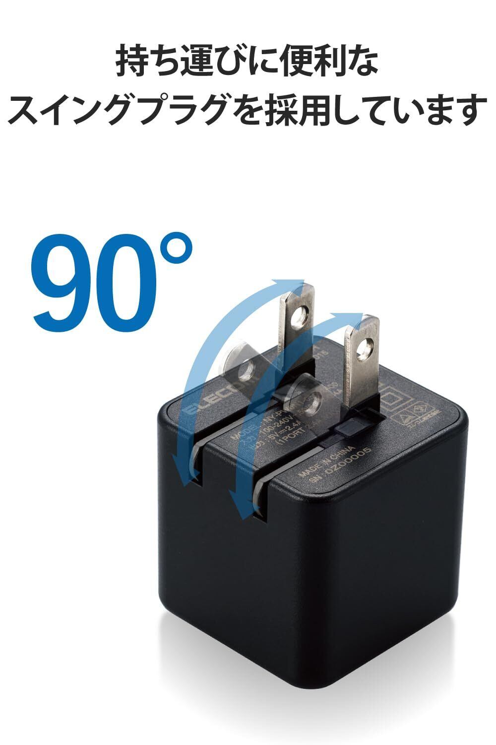 エレコム USB充電器 USB コンセント 合計12W (5V/2.4A) 2ポート USB-A コンパクト 折りたたみ式プラグ ブラック EC-AC3912BK