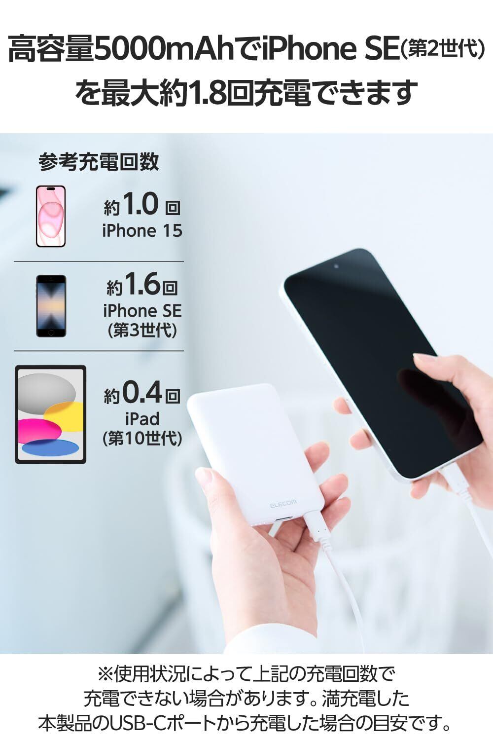 ■本製品(バッテリー容量5000mAh)で、1800mAhのスマートフォンを約1.8回、3000mAhのスマートフォンを約1.1回充電可能です。