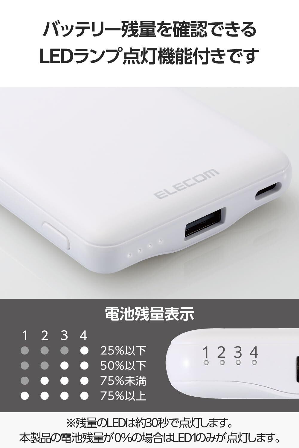 ■電池残量は4段階のLEDランプ点灯で確認可能です。