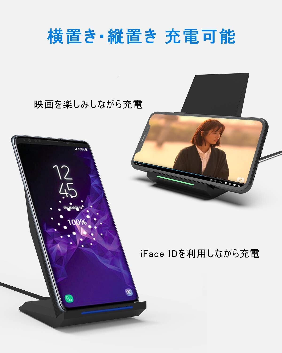 【iPhone 8以降の機種対応】このqi急速充電器はiPhone 8以降のiPhone 17/16/15/14シリーズから13/12/12 Pro/12 ProMax/SE (第2/3世代)/11/11 Pro/Xs/XR/Xs Max/X/8に最大7.5Wの出力で充電できます。充電しながらiPhoneを触る時、この角度はFACE IDをすぐに認識するので、充電中からの操作がとてもスムーズです。底にゴムがあるので、iPhoneの下も傷がつきにくいです。Xperia1 Ⅱのバッテリーの内蔵位置が下に下がっているため、充電の時、機体の下部をスタンド中心に近寄って置いてください。ご注意:iPhone12/13 miniについて、本機種のサイズが小さくて、内蔵バッテリーが右下に設計しているため、横置きはこのまま充電できます。縦置きで充電する場合、上に1cm程浮かんでいる状態で設置してください。