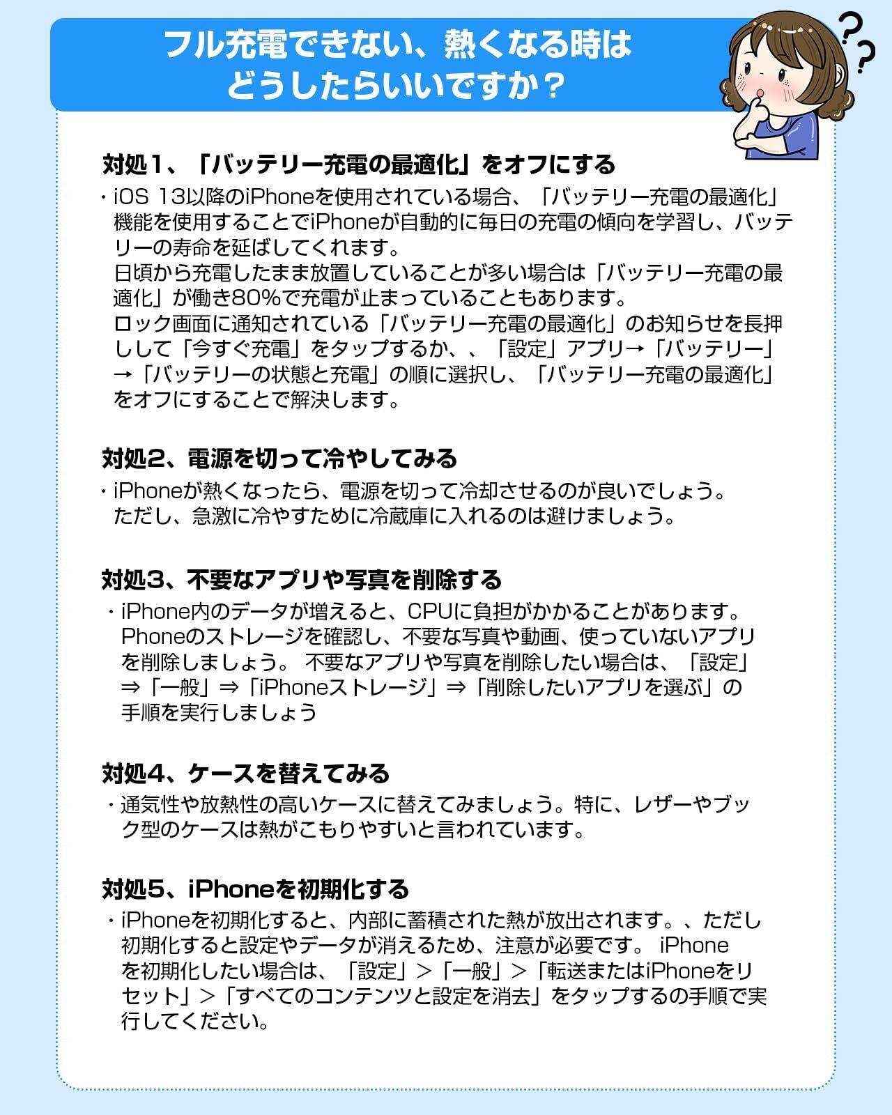 ※熱くなる時の対処: 対処1、電源を切って冷やしてみる:・iPhoneが熱くなったら、電源を切って冷却させるのが良いでしょう。ただし、急激に冷やすために冷蔵庫に入れるのは避けましょう。急激な温度変化で内部に結露が生じ、電子部品に損傷を与える可能性があるからです。 対処2、不要なアプリや写真を削除する:iPhone内のデータが増えると、CPUに負担がかかることがあります。Phoneのストレージを確認し、不要な写真や動画、使っていないアプリを削除しましょう。 不要なアプリや写真を削除したい場合は、「設定」⇒「一般」⇒「iPhoneストレージ」⇒「削除したいアプリを選ぶ」の手順を実行しましょう。 対処3、ケースを替えてみる:通気性や放熱性の高いケースに替えてみましょう。特に、レザーやブック型のケースは熱がこもりやすいと言われています。 対処4、iPhoneを初期化する:iPhoneを初期化すると、内部に蓄積された熱が放出されます。、ただし初期化すると設定やデータが消えるため、注意が必要です。 iPhoneを初期化したい場合は、「設定」>「一般」>「転送またはiPhoneをリセット」>「すべてのコンテンツと設定を消去」をタップするの手順で実行してください。