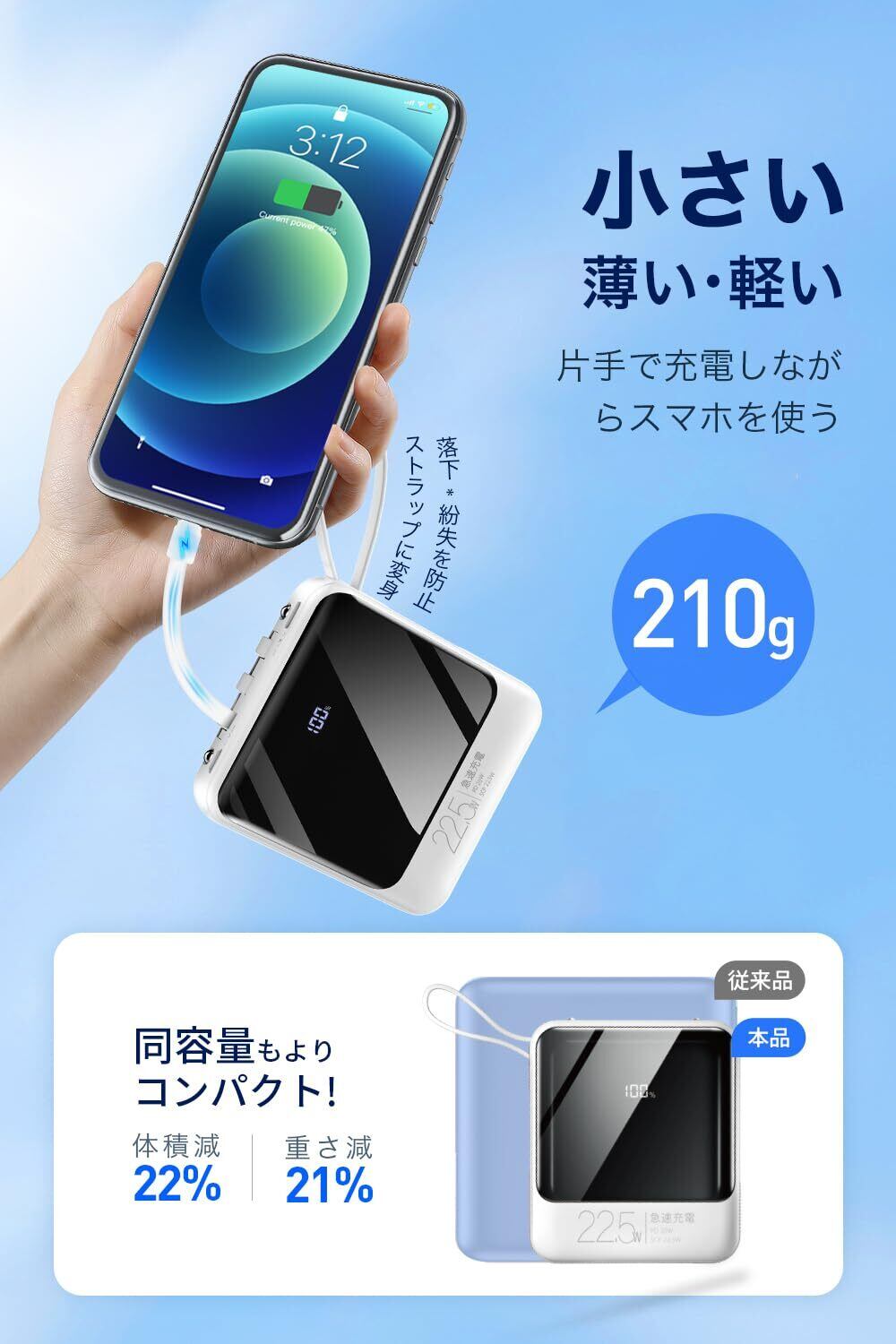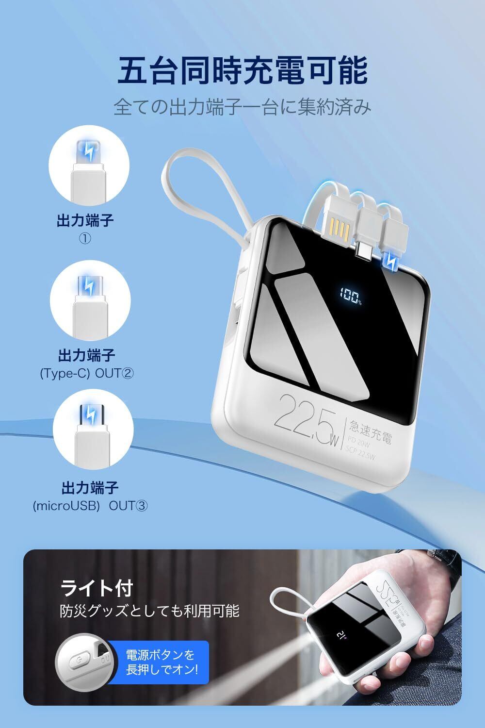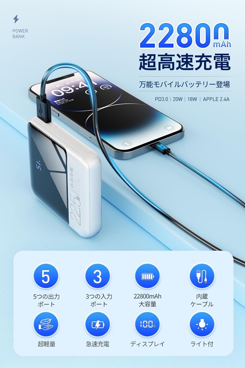【軽量・小型・大容量携帯充電器】ポケットにも収まるほどコンパクトなボディで、22800mAh大容量を備える軽量・小型モバイルバッテリーです。スマホ、タブレットなどのデバイスへ複数回も充電可能で、内蔵ケーブルがストラップのように使え、片手で充電しながらスマホも使用可能で、持ち運びに超便利。出張、旅行、移動中、キャンプなどの時でもバッテリー切れを心配することはなく、台風、地震など緊急災害時に非常用電源としても使えます。