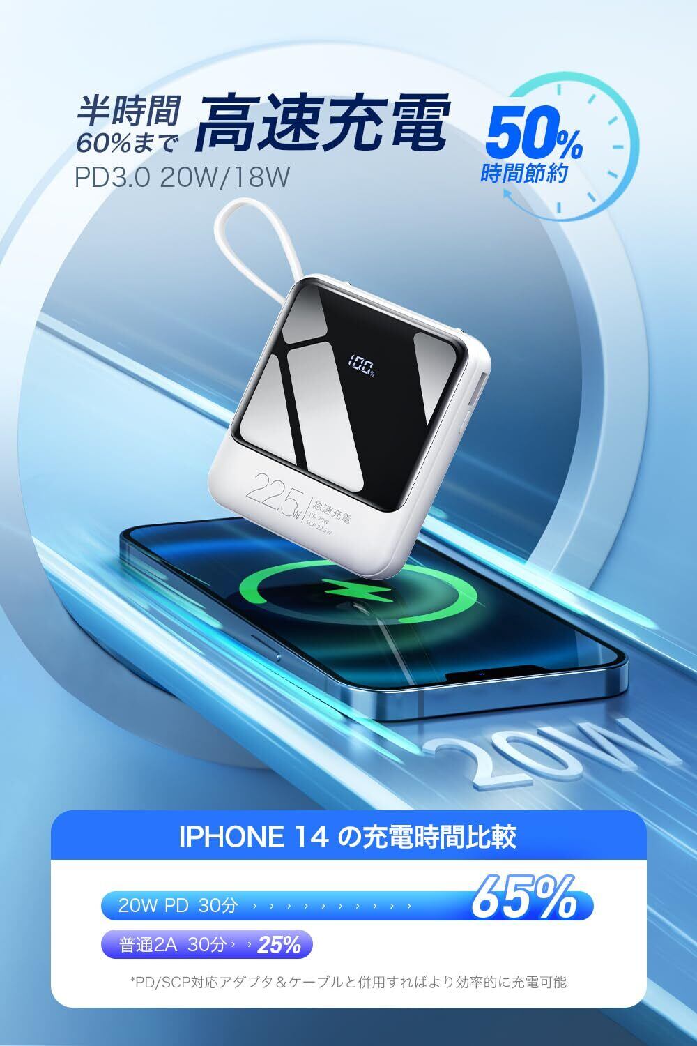 【PD20W/SCP22.5W急速充電対応】PD3.0対応し、圧倒的な高速充電を誇る急速充電器、わずか30分で50%以上に充電可能。一般的なポータブル電源と比べて約5倍速く、充電スピードが大幅に上げて充電時間の短縮が実現されました。急速充電に対応しない機種でも、SmartIC機能によりデバイスを自動で判別し、最適な出力で充電を行うことが可能。急に思い立った旅行でも、パックしている間にフル充電され、すぐに出かけることができます。