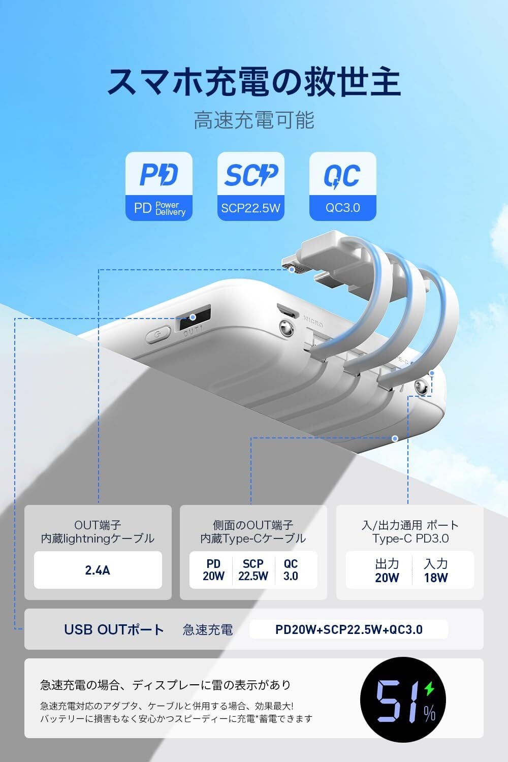 特徴 デジタルディスプレイ, ポケットサイズ, 内蔵ケーブル, 懐中電灯, 高速充電