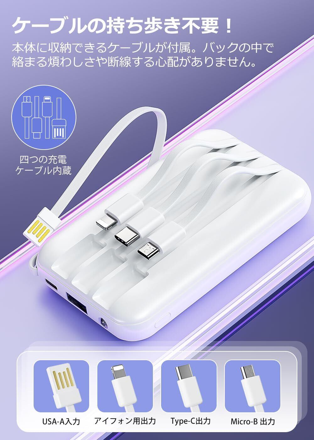 【急速充電可能なポート・4種類ケーブル内蔵】最大2.1Aで急速充電可能USB-A出力ポートを搭載することで、通常の5W出力に比べ3倍以上の速度で充電することができ、30分で約50%まで充電することができます。モバイルバッテリーの本体はUSB-A出力ポートと三つの出力ケーブルを内蔵されており、最大4台のデバイスの同時充電が可能、コンセントのない場所でも手軽に充電できるため、安心して出かけることが可能。【1%刻みで残量を表示するディスプレイを搭載】バッテリー残量が具体的な数字表示というところが決めた!あいまいな点滅ランプとは違い、新常識なLED(light-emitting diode)表示設計により、バッテリー残量と急速充電状態が一目瞭然できますので、充電のタイミングがより掴みやすく、充電切れの心配もありません。