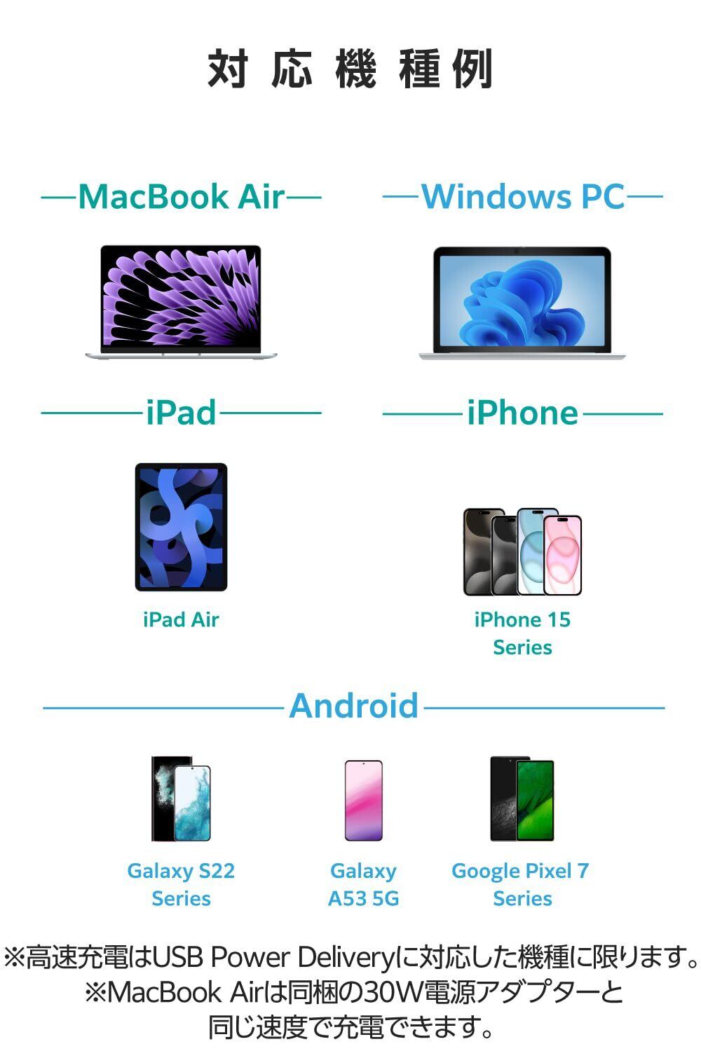 ■USB Power Delivery 30Wで充電可能。Macbook Airに同梱の30W 電源アダプターと同じ速度で充電できます。