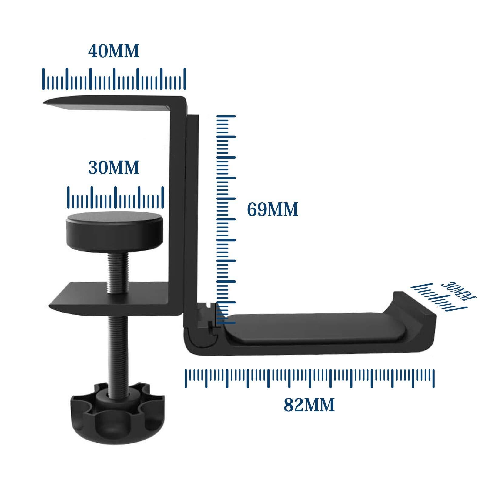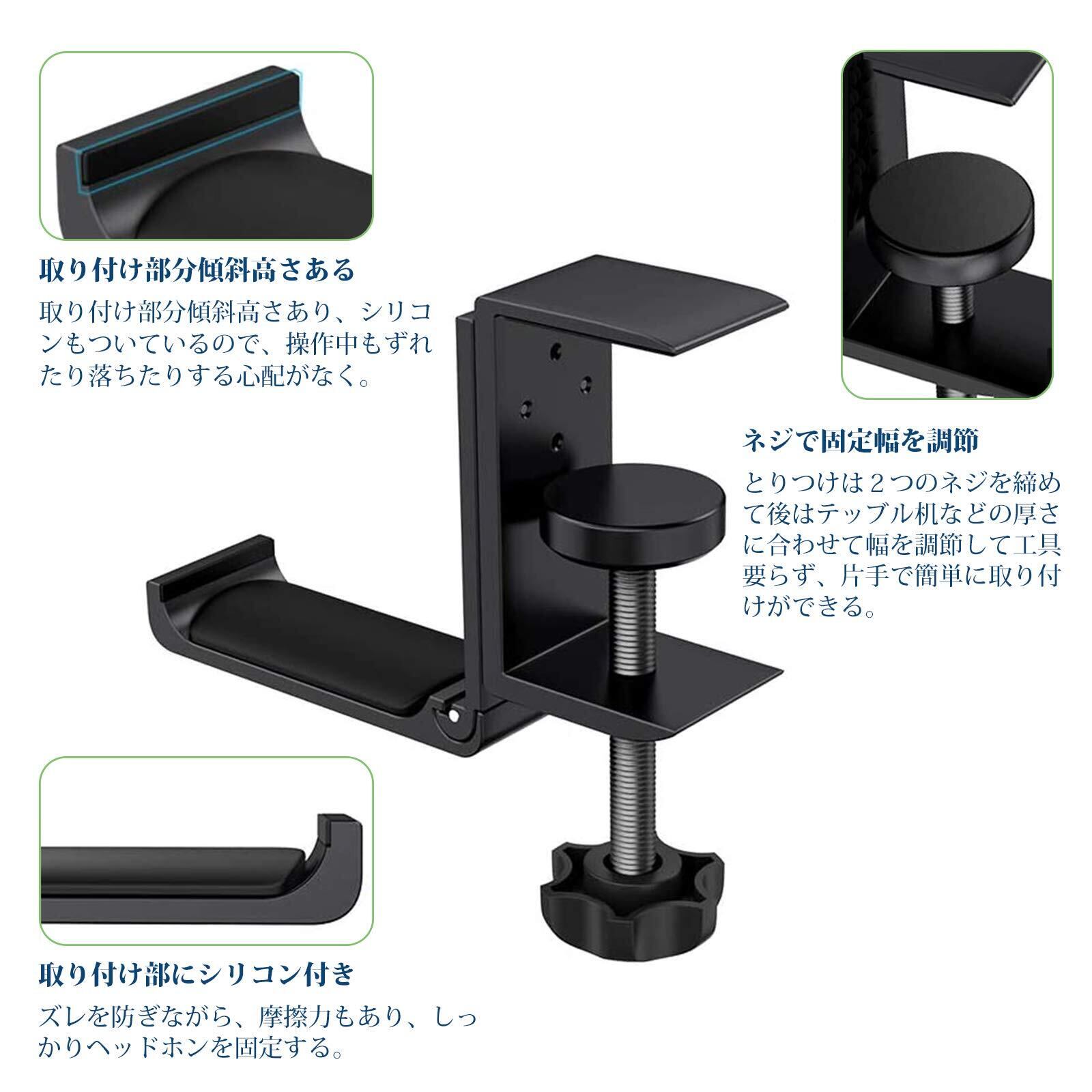 取り付け簡単:調節可能なノブは、簡単に回転させて固定することができ、接着剤は不要で、取り付け、取り外し、または移動が簡単。クランプを机に挟むだけなのですが、きっちり固定できます。スタンド式のホルダーではかけられない高さのあるヘッドホンでも簡単に設置することができます。