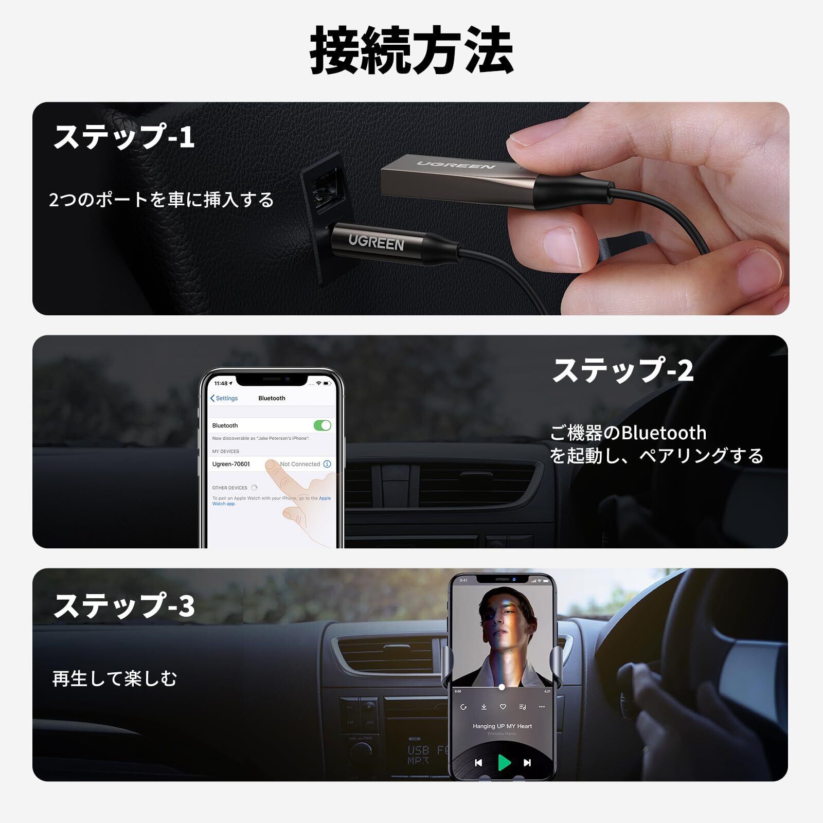 【簡単にペアリンク】:受信機の電源をオンにすれば、自動的にペアリング可能です。3.5mmオーディオ端子はカースピーカーなどのオーディオ出力機器の接続に、USB-A端子は本製品の電源供給に使用します。