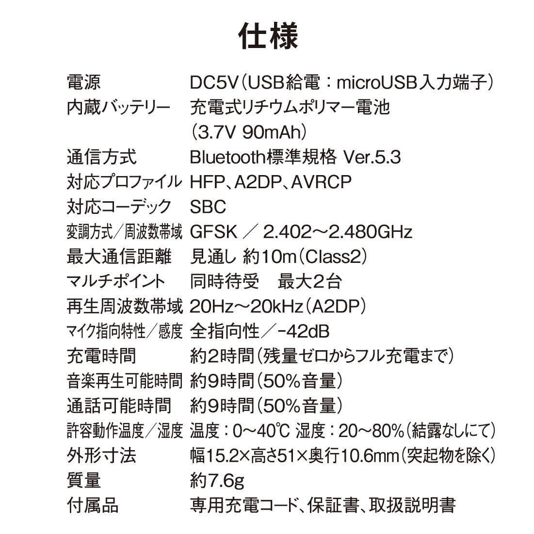 【 仕 様 】 ◆電源:DC5V(USB給電…microUSB入力端子) ◆内蔵バッテリー:充電式リチウムポリマー電池(3.7V 90mAh) ◆通信方式:Bluetooth標準規格 Ver.5.3 ◆対応プロファイル:HFP、A2DP、AVRCP ◆対応コーデック:SBC ◆変調方式/周波数帯域:GFSK/2.402~2.480GHz