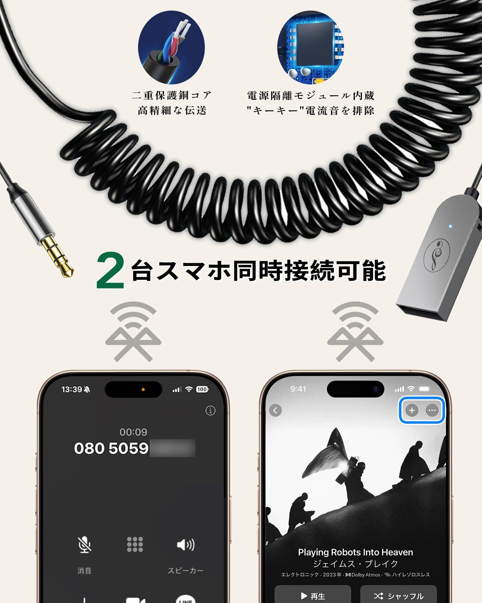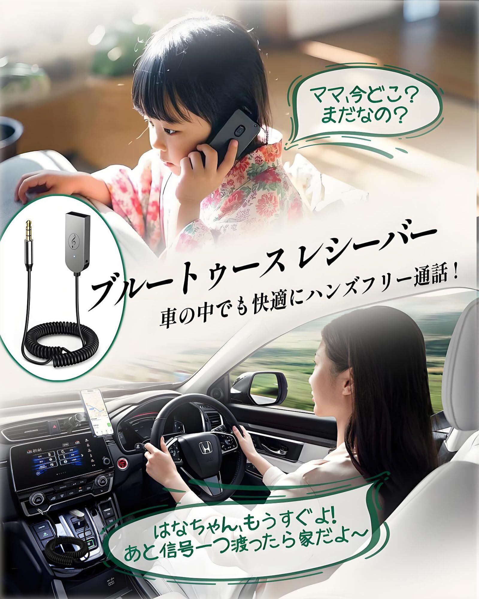 Bluetoothレシーバー 車載 AutimHoo Bluetooth5.3 受信機 車載オーディオ ワイヤレスオーディオ受信機 ブルートゥース化 マイク内蔵ハンズフリー通話対応 3.5mm AUX - USB給電式(充電不要)、二台スマホ同時接続可能 小型軽量 改良絶縁チップ雑音無くす、自動車・ホームステレオ・スピーカーなど対応音楽再生