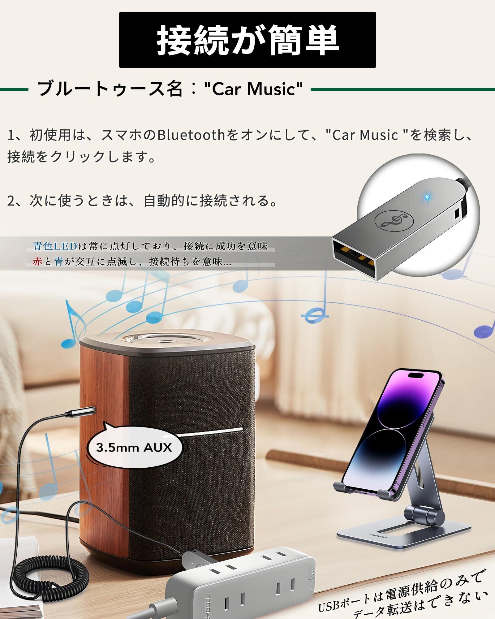 ❣【簡単な操作&Bluetoothペアリング】:USBポートを電源に差し込むと、受信機の電源が自動的にオンになります。3.5mmオーディオ端子はカースピーカーなどのAUXオーディオ出力機器の接続。初めて使用する場合は、Bluetooth携帯電話の電源を入れ、「Car Music」を検索し、接続をクリックし、ペアリングコード「0000」を入力してください。その後、自動的に接続されます。一部OSの旧バージョンでは正常に動作しない場合があります。お使いの機器のOSが最新版にアップデートされていることを確認してください。