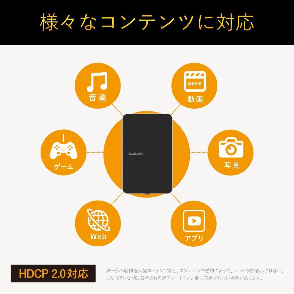 本製品をテレビに接続することで、スマートフォンやタブレット、PCなどの画面をワイヤレスでテレビの大画面に映し出すことができるMiracastレシーバです。動画や写真、ウェブブラウザ、アプリなど、多彩なコンテンツを表示可能です。YouTubeの動画なども大画面で楽しむことができます。Full HD(解像度:1920×1080、フレームレート:60fps)に対応しているので、高画質・高音質のスマホコンテンツも大画面で楽しむことができます。